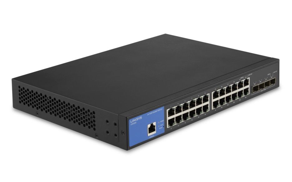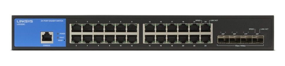 Керований гігабітний комутатор LINKSYS LGS328C з 24 портами та 4 гігабітними каналами висхідного зв'язку SFP+ 10 Гбіт/с є універсальним рішенням для керування пристроїв у мережах бізнес-класу, забезпечення безпеки, швидкості та якості обслуговування.