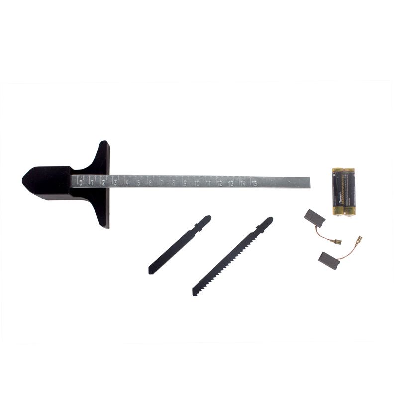 Комплектація:інструкція, Гарантійний талон, Лобзик, Картонна коробка, Адаптер для пиловідведення, прозорий захисний екран, додаток №1, пластикова накладка базової опори, ключ для складання/регулювання, пиляльне полотно, пластикова направляюча вставка опори, комплект батарей для лазера