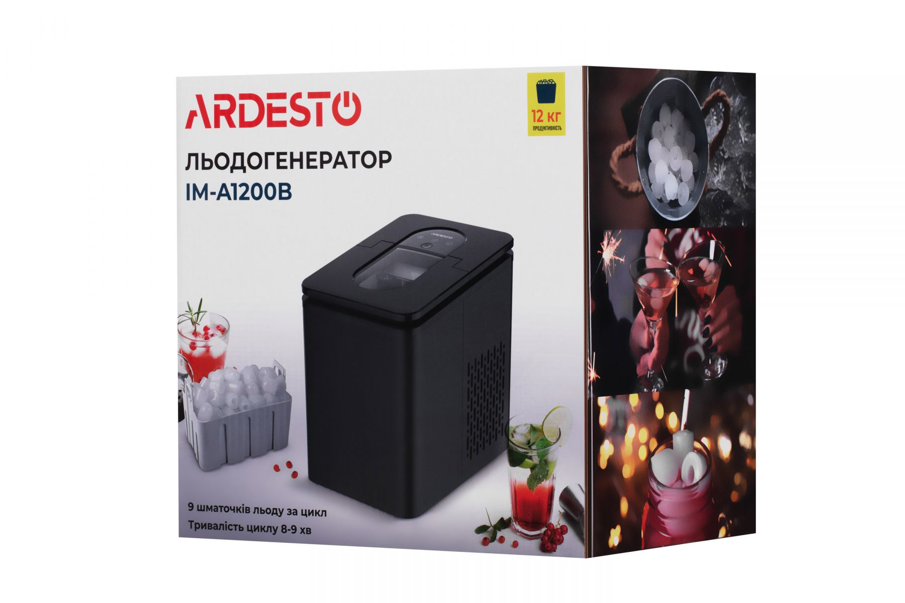 Портативний побутовий льодогенератор для швидкого приготування харчового льоду. Пристрій виконаний у стильному і практичному корпусі чорного кольору, оснащений сенсорною панеллю керування, індикаторами роботи та віконцем для візуального контролю кількості льоду. Клас захисту – І. Максимальна продуктивність ARDESTO IM-A1200B – 12 кг льоду на добу. Контейнер для льоду – 0,6 кг, цикл приготування льоду триває близько 9 хв. Об’єм резервуара – 1,8 л.