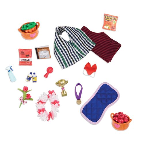 Комплектація:книга, 1 кошик із яблуками, 1 кошик із морквою, 1 розпилювальна пляшка, 1 кубок, 1 призова стрічка, 1 медаль, 1 шампунь, 1 кондиціонер, 1 годівничка для коня, 1 сумка з кормом для коня, 1 вінок для коня, 1 квітковий букет, 1 сідло, 1 покривало для коня, 1 шапочка для коня