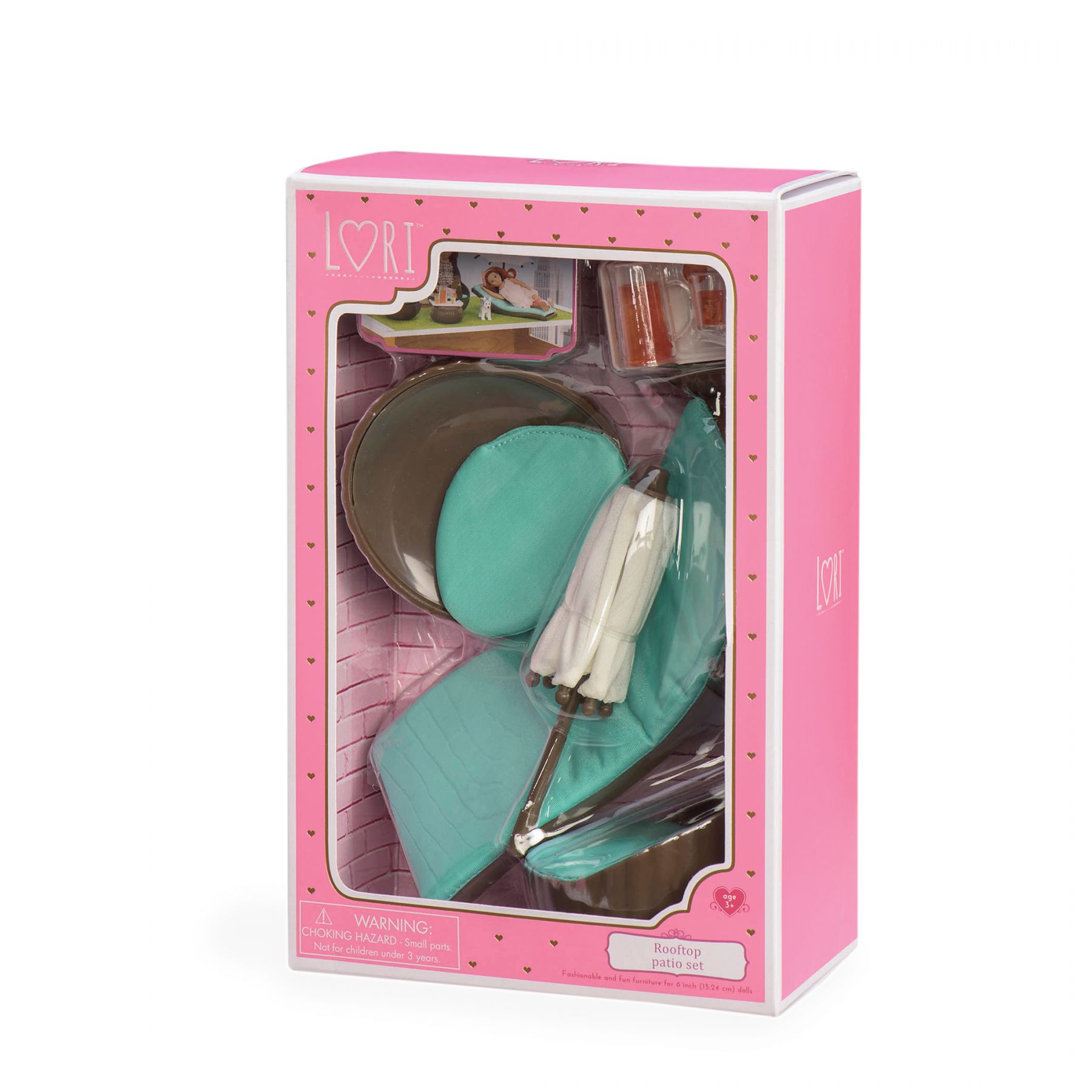 Створюйте атмосферу відпочинку та комфортне місце для цікавих бесід за чашкою кави, завдяки набору меблів від LORI. Деталі з комплекту виготовлені із текстилю і якісної пластмаси, та є абсолютно безпечними для малюків. Окрім того, набір сумісний з усіма ляльками LORI 15 см. У комплект входить: столик, таця, глечик, 2 склянки, шезлонг з парасолькою, 2 крісла з подушками. Разом з меблями LORI облаштувати місце для відпочинку для улюбленої лялечки – дуже просто. Комплектація: 12 предметів. Розмір упаковки: 26 х 9 х 16 см. Рекомендований вік: 3+.