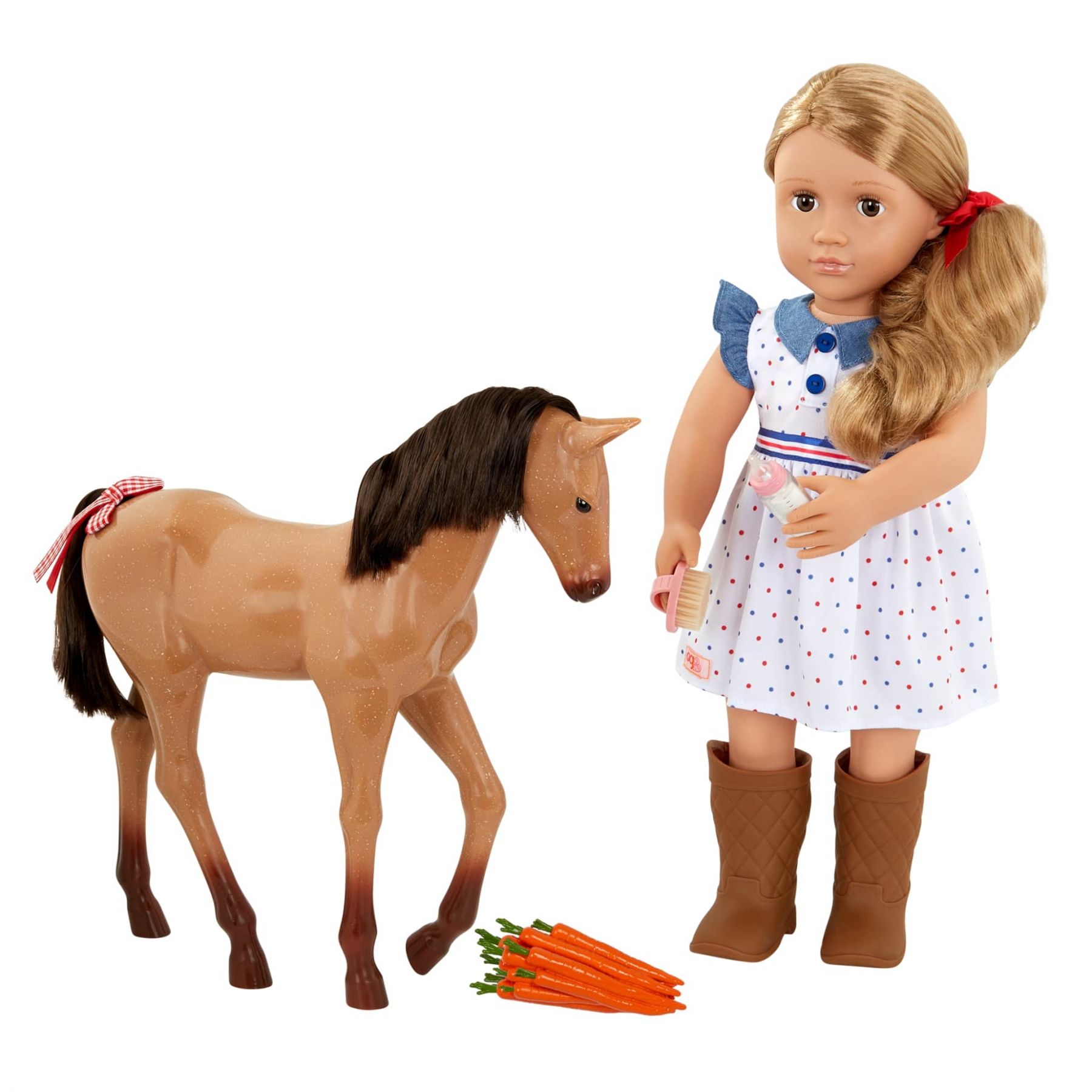 Комплектація:лялька, пляшечка, щіточка, нижня білизна, сукня, пара чобіт, 2 бантика для волосся, лоша, пучок моркви