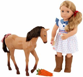 Розвивайте своє ранчо разом із Шеллі, та дізнайтеся як доглядати за новонародженим лошам! Шеллі - 46-сантиметрова ігрова лялька Our Generation, яка обожнює коней і мріє стати справжньою вершницею. Разом із нею до набору входить чарівне лоша породи Аппалуза висотою 30 см з блискучою шерстю, шовковистою гривою та хвостом, які можна розчісувати і прикрашати бантиком.