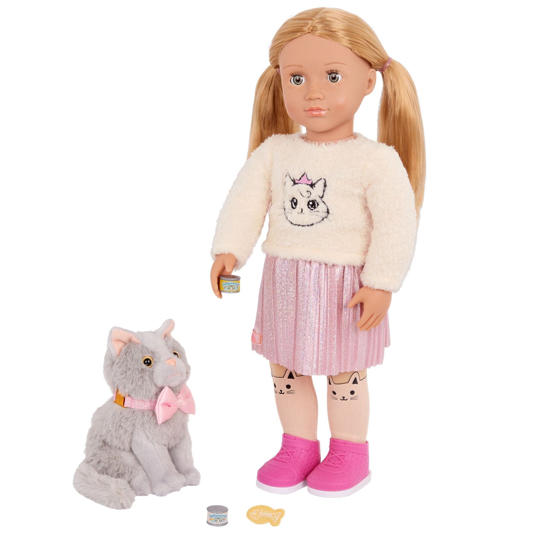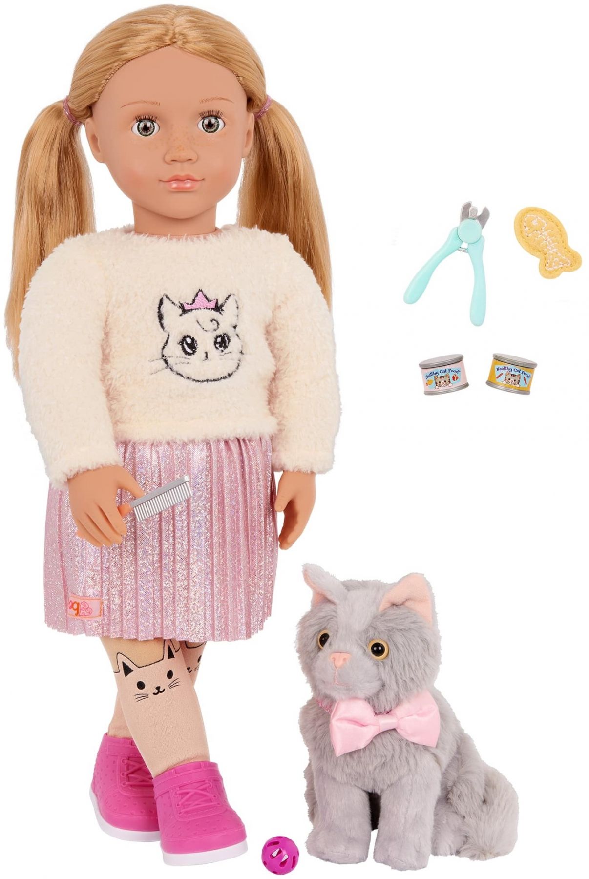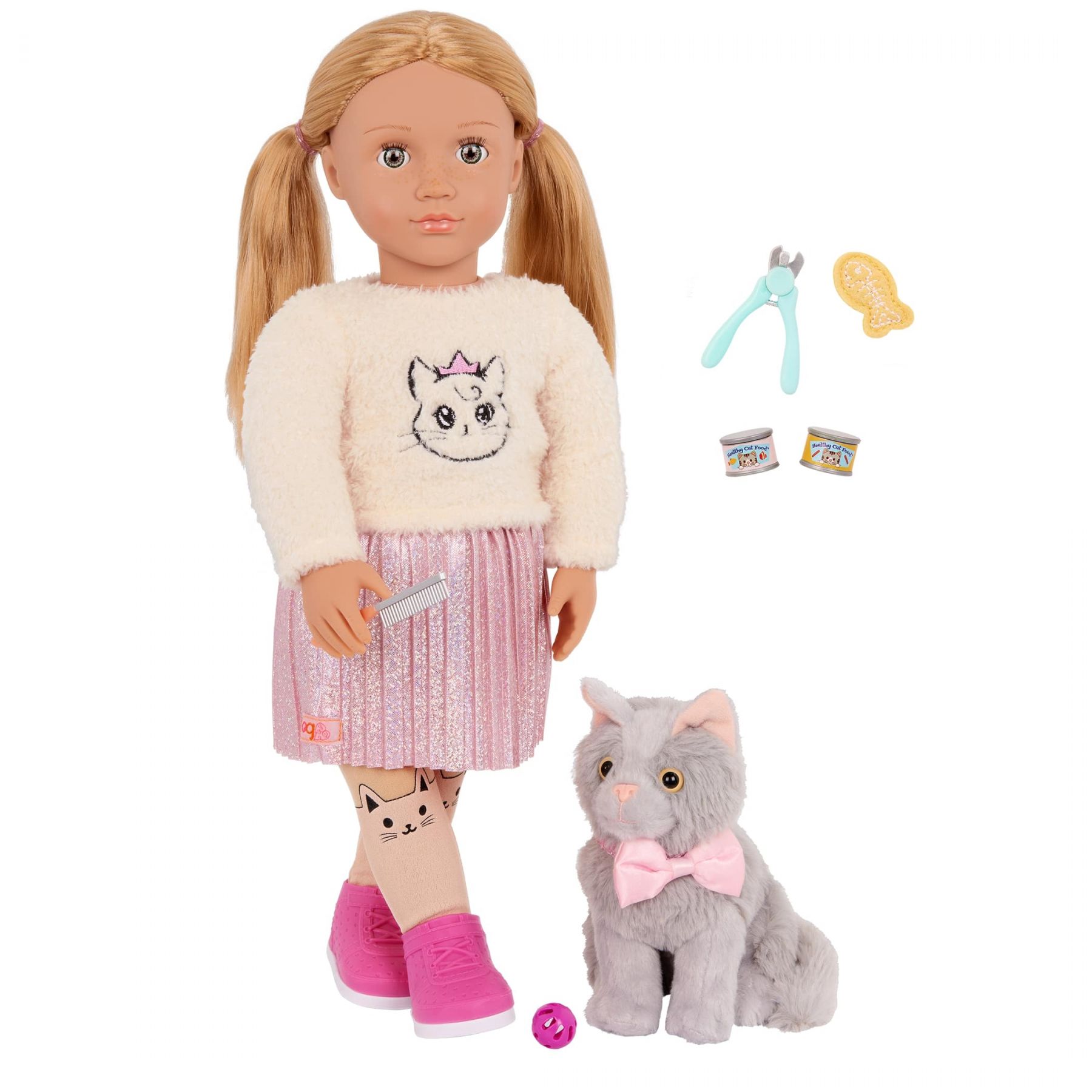 Комплектація:гребінець, лялька, м'ячик, пара взуття, нижня білизна, легінси, спідниця, светр, кошеня, нашийник-бантик, 2 банки корму, іграшка-рибка, щипці для стрижки кігтів