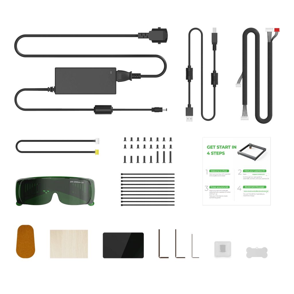 Комплектація:інструкція, USB-кабель, Гвинт, Шнур живлення, окуляри, 3х шестигранний ключ, з'єднувальний кабель, шкіряна заготовка, фанера, алюмінієвий лист, лист з нержавіючої сталі, картонна картка, ремені