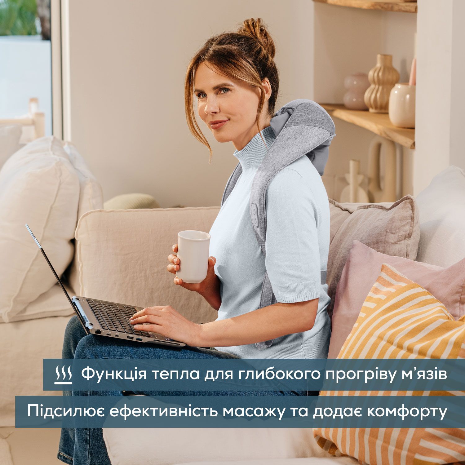 Масажер для шиї забезпечує комфортний та глибокий розминаючий масаж. Чотири масажні головки та два масажні «пальці» імітують рухи рук. Це створює ефект, як при справжньому масажі. Працює від акумулятора до 2 годин без підзарядки. Зручні ремінці для кріплення на плечах дозволяють залишати руки вільними. Ручні петлі дозволяють легко налаштувати інтенсивність масажу. Функція нагріву підсилює ефект та допомагає розслабитися. Прекрасний варіант для подарунка.