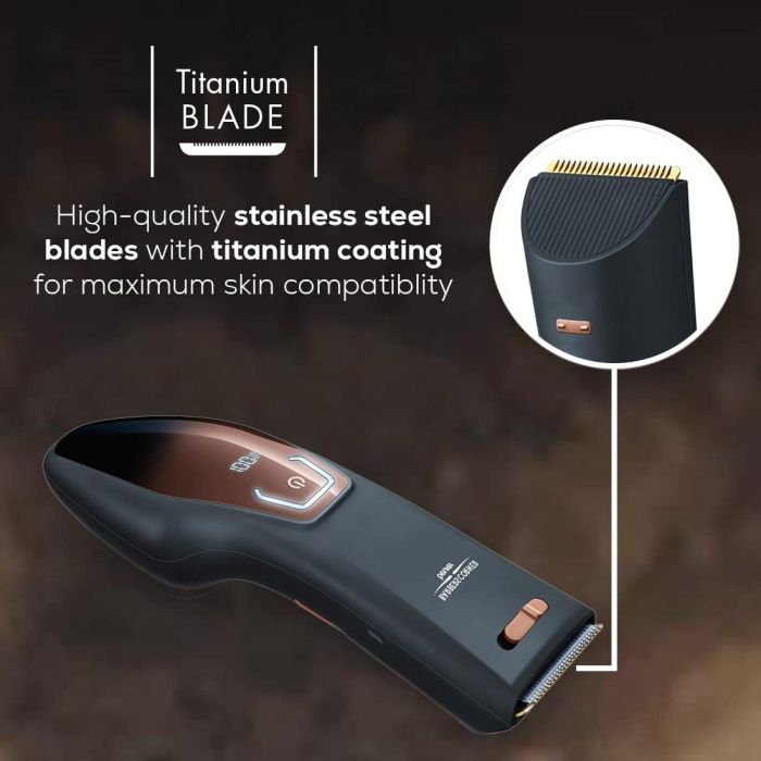 За допомогою машинки для стрижки волосся HR 5000 можна легко та точно підстригти волосся на голові. Високоякісне сталеве лезо приладу має титанове покриття, яке не подразнює шкіру. Завдяки двом насадкам-гребеням та п'яти рівням точного юстування без зусиль відрегулюєте довжину стрижки та створіть чіткі контури. Машинка для стрижки волосся має світлодіодний дисплей з індикаторами акумулятора, блокування та заряду. Крім того, за допомогою символу світлодіодний дисплей підкаже, коли потрібно змастити сталеве лезо. Можете використовувати прилад з живленням як від акумулятора, так і через адаптер мережі, що входить в комплект поставки. Заряд потужного літієвого акумулятора для стрижки волосся розрахований на 60 хвилин роботи. Для гігієнічного очищення лезо можна зняти та промити під проточною водою.