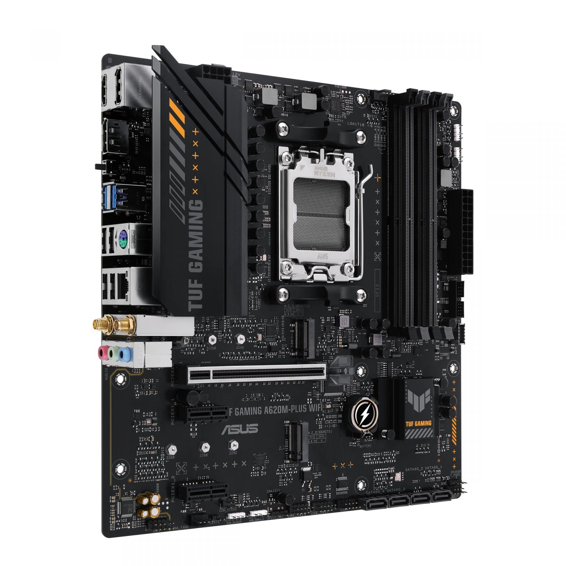 ASUS TUF GAMING A620M-PLUS WIFI увібрала в себе всі основні елементи процесорів AMD Ryzen 7000-ї серії та поєднала їх з ігровими функціями і перевіреною довговічністю. Завдяки компонентам військового класу, модернізованій системі живлення та комплексній системі охолодження ця материнська плата перевершує всі очікування, забезпечуючи надійну та стабільну продуктивність для марафонських ігор. Материнські плати TUF GAMING також проходять суворі випробування на витривалість, щоб гарантувати, що вони зможуть впоратися з умовами, в яких інші можуть зазнати невдачі. Естетично ця модель відрізняється міцним чорним кольором і геометричними елементами дизайну, що відображають надійність і стабільність, які визначають серію TUF GAMING. Ця платформа забезпечує потужність і можливості підключення, яких вимагають сучасні комп'ютерні програми зі штучним інтелектом.