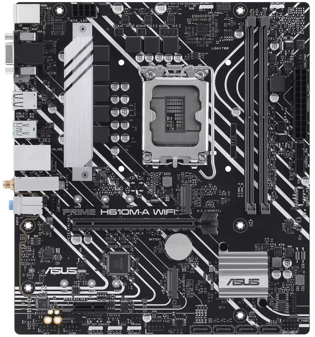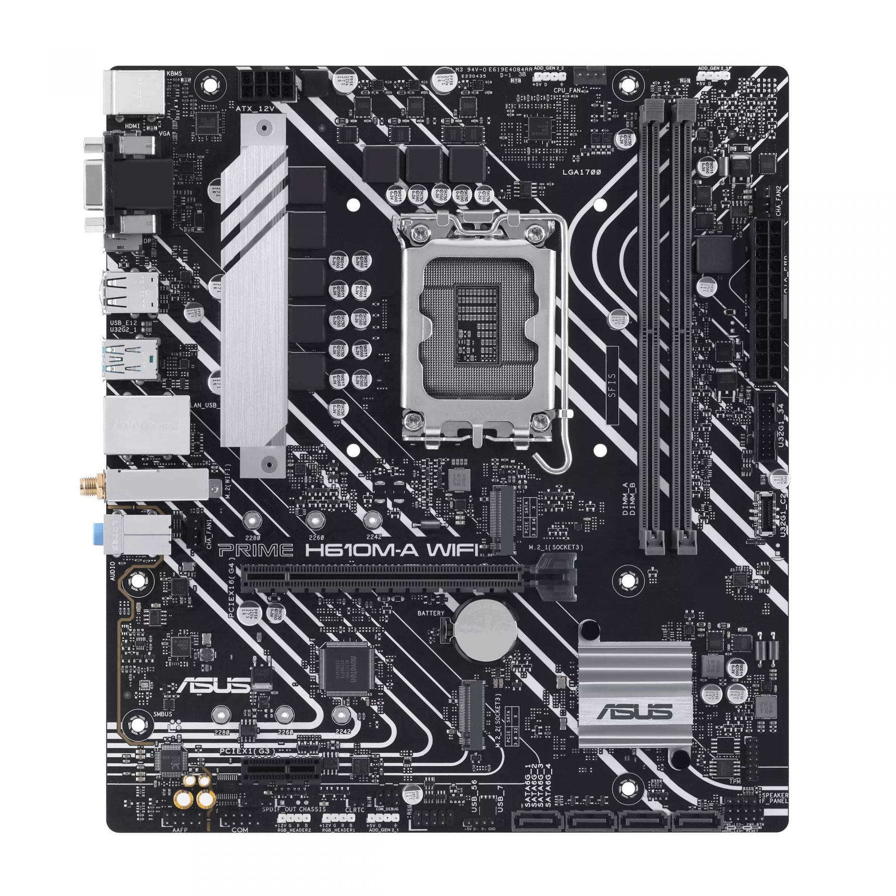 Материнська плата ASUS PRIME H610M-A Wi-Fi побудована на чіпсеті Intel H610 та підтримує процесори Intel Core 12-го, 13-го і 14-го покоління, а також Pentium Gold і Celeron (сокет LGA1700). Має два слоти DDR5 DIMM (до 96 ГБ), один PCIe 4.0 x16, один PCIe 3.0 x1, два роз’єми M.2 та чотири порти SATA 6 Гбіт/с.