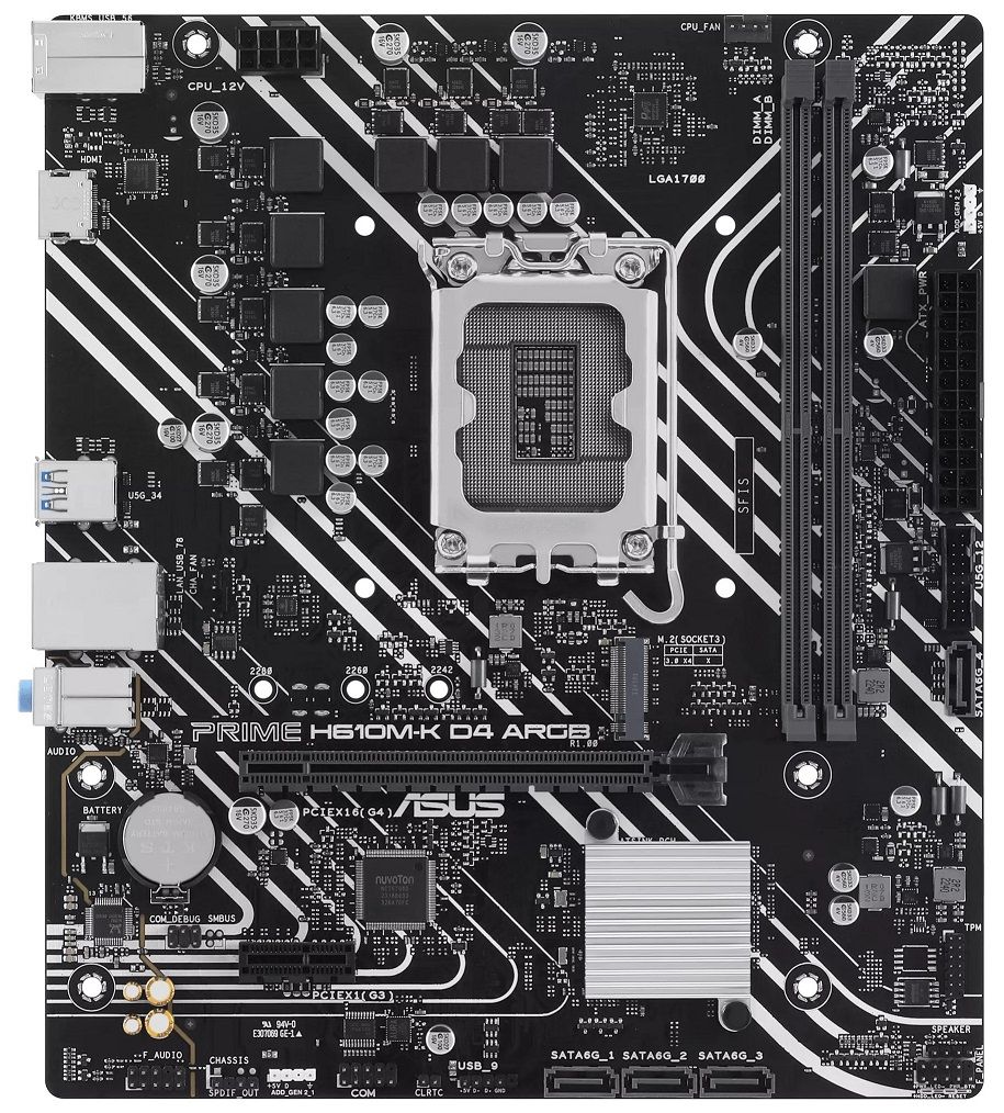 Материнська плата ASUS PRIME H610M-K D4 ARGB створена для систем на базі процесорів Intel з рознімом LGA1700. Форм-фактор micro-ATX зручний для компактних корпусів і збалансованих конфігурацій. Плата працює з пам’яттю DDR4 та має слот M.2 для швидких накопичувачів. Наявність HDMI та D-Sub спрощує під’єднання дисплеїв. Адресні RGB-розніми дають змогу організувати кероване підсвічування системи.