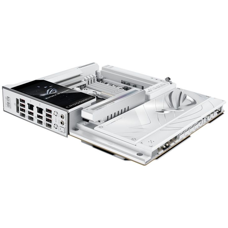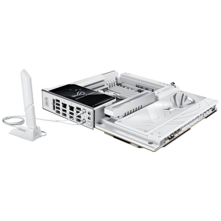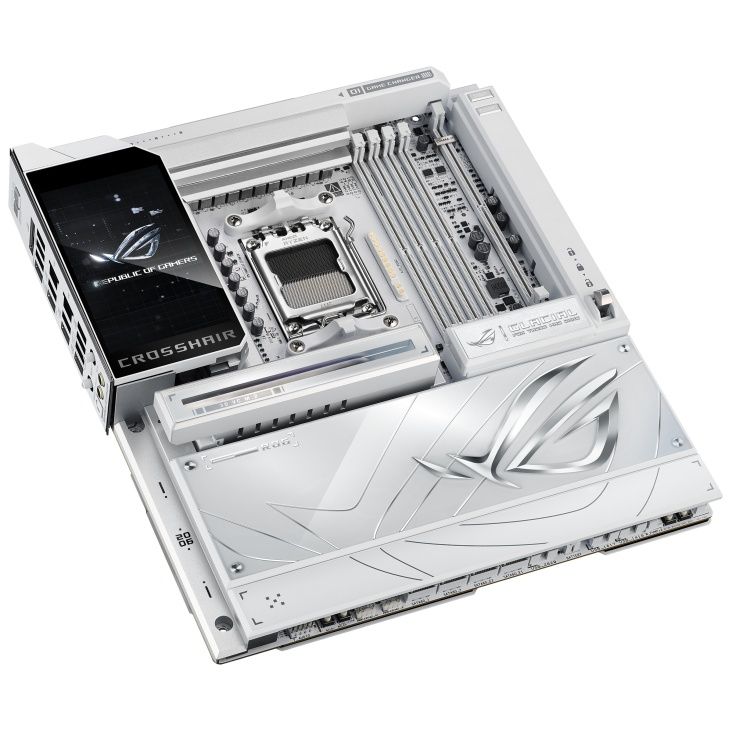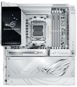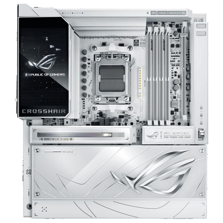Материнська плата ASUS ROG CROSSHAIR X870E GLACIAL на чіпсеті AMD X870E виконана в білому кольорі та підтримує процесори Ryzen 9000, 8000 та 7000 серій на сокеті AM5. Забезпечує до 256 ГБ DDR5 з розгоном до 9600+ MT/s, до семи слотів M.2 завдяки комплектним картам ROG Hyper M.2 та ROG Q-DIMM.2, два PCIe 5.0 x16 слоти та подвійний 10 Гбіт/с Ethernet. Оснащена Wi-Fi 7, двома USB4 40 Гбіт/с портами, повнокольоровим 5-дюймовим РК-дисплеєм та преміум-аудіо SupremeFX з ESS DAC.