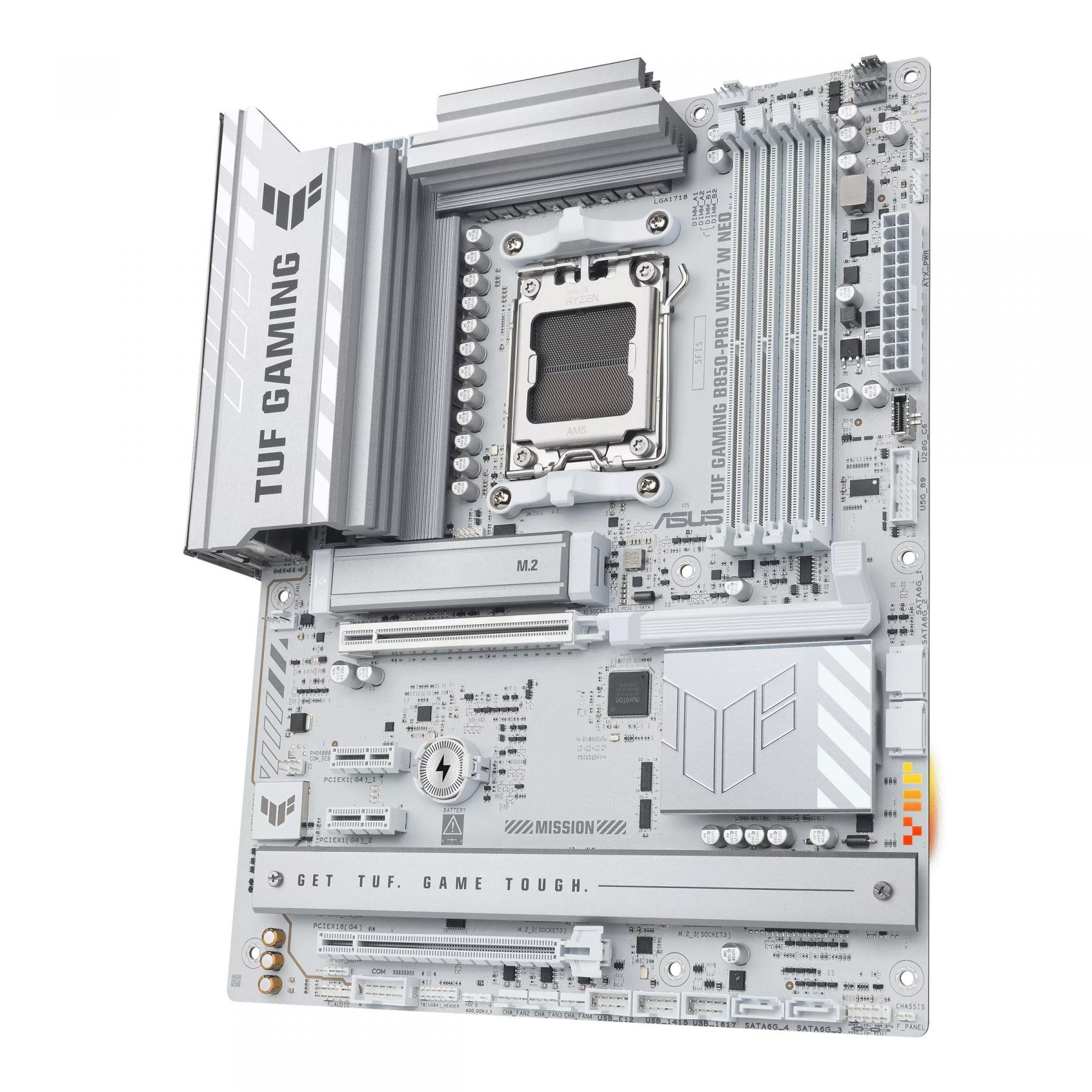 Материнська плата ASUS TUF GAMING B850-PRO WIFI7 W NEO побудована на сокеті AM5 з чипсетом B850 та підтримує DDR5-пам'ять до 256 ГБ з можливістю розгону до 9000+ MT/s. Плата оснащена PCIe 5.0 x16 для відеокарти, трьома слотами M.2 (один PCIe 5.0), Wi-Fi 7, 2.5Gb Ethernet та розширеним набором USB-портів, включно з фронтальним 20 Gbps Type-C. Міцна система живлення 14+2+1 (80A) та ефективне охолодження VRM і M.2 забезпечують надійність під високим навантаженням.