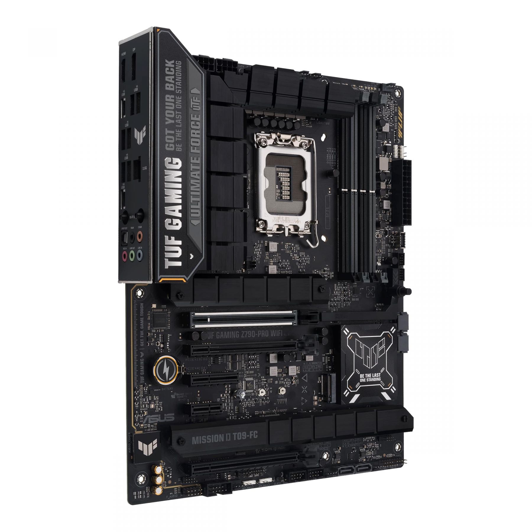 TUF GAMING Z790-PRO WIFI поєднує в собі новітні процесори Intel з ігровими функціями та міцністю військового рівня. Завдяки преміальній системі живлення та комплексній системі охолодження ця материнська плата забезпечує стабільну продуктивність для марафонських ігор. Крім того, вона проходить суворі випробування на витривалість, щоб гарантувати надійність у складних умовах. Тим часом на радіаторі VRM красується характерна сіра прогумована емблема, що підкреслює основну суть енергійності TUF GAMING.