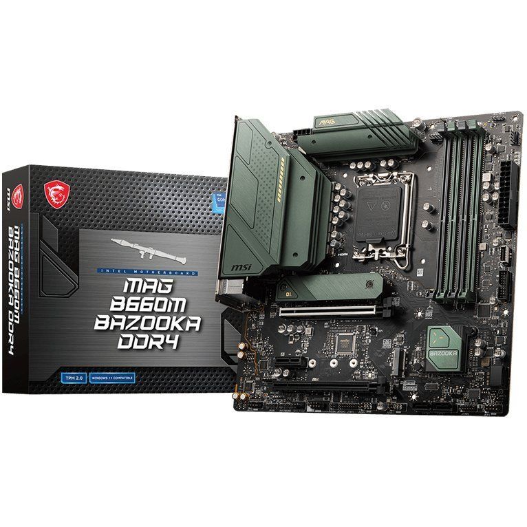 MAG B660M BAZOOKA DDR4 - це материнська плата форм-фактору Micro-ATX від компанії MSI. Вона підтримує процесори Intel 12-го покоління з роз'ємом LGA 1700. Підтримка пам'яті DDR4 із частотою до 4800+ МГц (в режимі розгону).