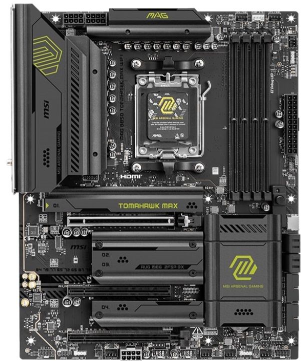 MAG B850 TOMAHAWK MAX WIFI створена для геймерів, яким потрібна стабільна, довговічна та зручна для збирання основа для ПК. Завдяки справжньому рішенню Wi-Fi 7, 5G LAN, USB 20 Гбіт/с, рішенням PCIe 5.0, додатковому живленню PCIe та ексклюзивним функціям EZ DIY він готовий до битви на полі бою з процесорами AMD Ryzen серії 9000.