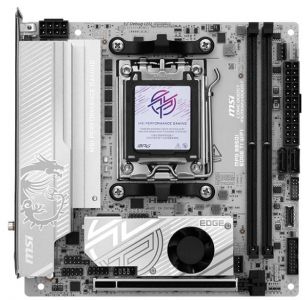 MSI MPG B850I EDGE TI WIFI — потужна материнська плата формату Mini-ITX, створена для компактних і стильних систем на базі процесорів AMD Ryzen 9000/8000/7000. Вона поєднує підтримку DDR5 до 128 ГБ, слоти PCIe 5.0 і M.2, надшвидкий Wi-Fi 7, 5G LAN та Bluetooth 5.4. Елегантний сріблясто-білий дизайн робить її відмінною основою для збірки в білому корпусі.