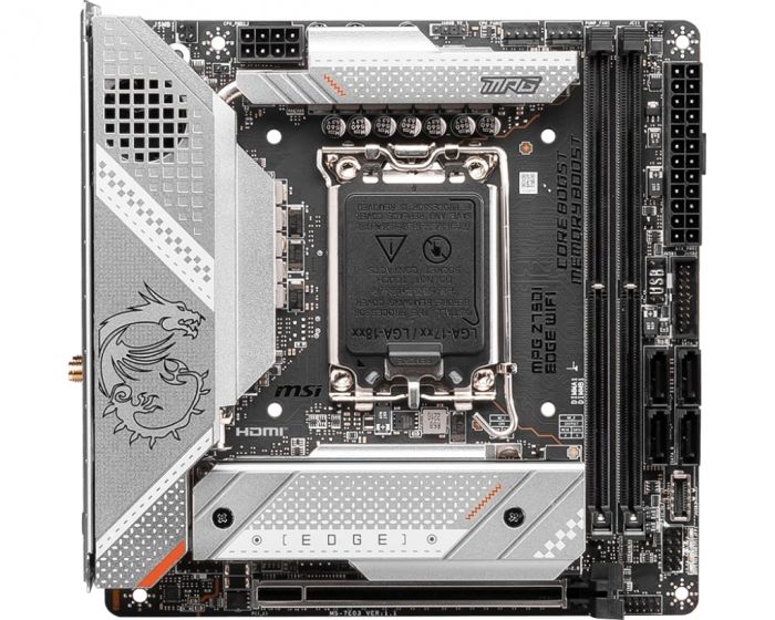 MPG Z790I EDGE WIFI використовує сріблясто-білу кольорову гаму, щоб продемонструвати індивідуальність. Вона не тільки стильна, але й потужна. Підтримує процесори Intel Core 12-го/13-го поколінь, Pentium Gold і Celeron для сокету LGA 1700. Підтримка пам'яті DDR5, у двоканальному режимі, 8000+ МГц (OC).