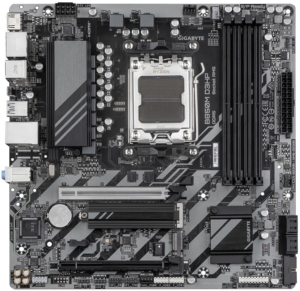 GIGABYTE B850M D3HP – продуктивна microATX материнська плата з роз’ємом AM5 для новітніх процесорів AMD Ryzen 9000 / 8000 / 7000 серій. Підтримує DDR5 до 8200 МТ/с (OC), має 2 слоти M.2 (PCIe 5.0 та 4.0), 4 слоти для памʼяті до 256 ГБ, відеовиходи HDMI + 2xDP, GbE LAN і повну сумісність із Windows 11.