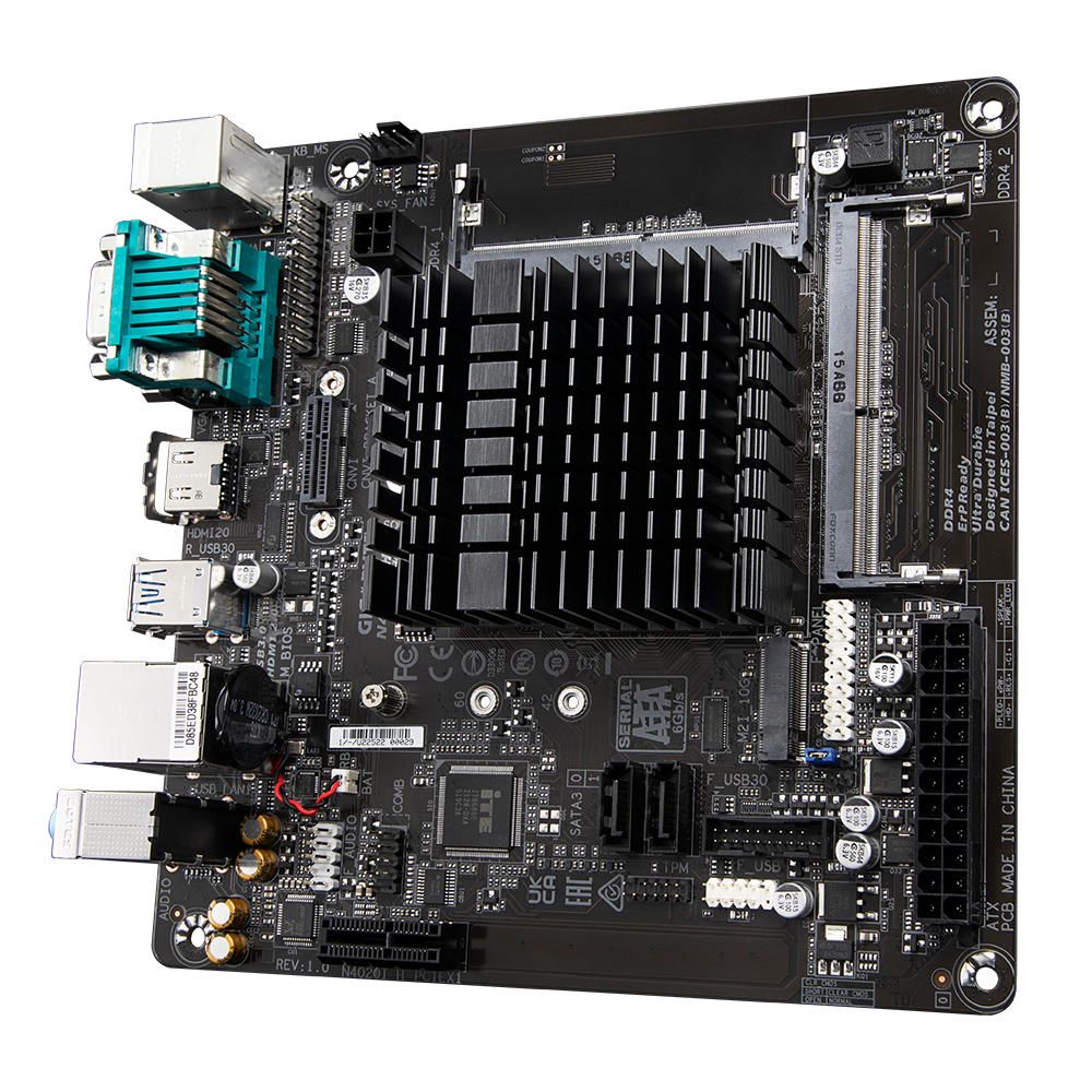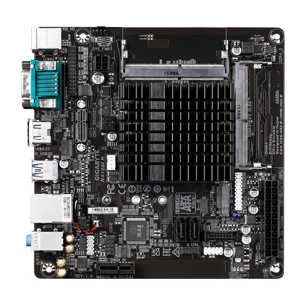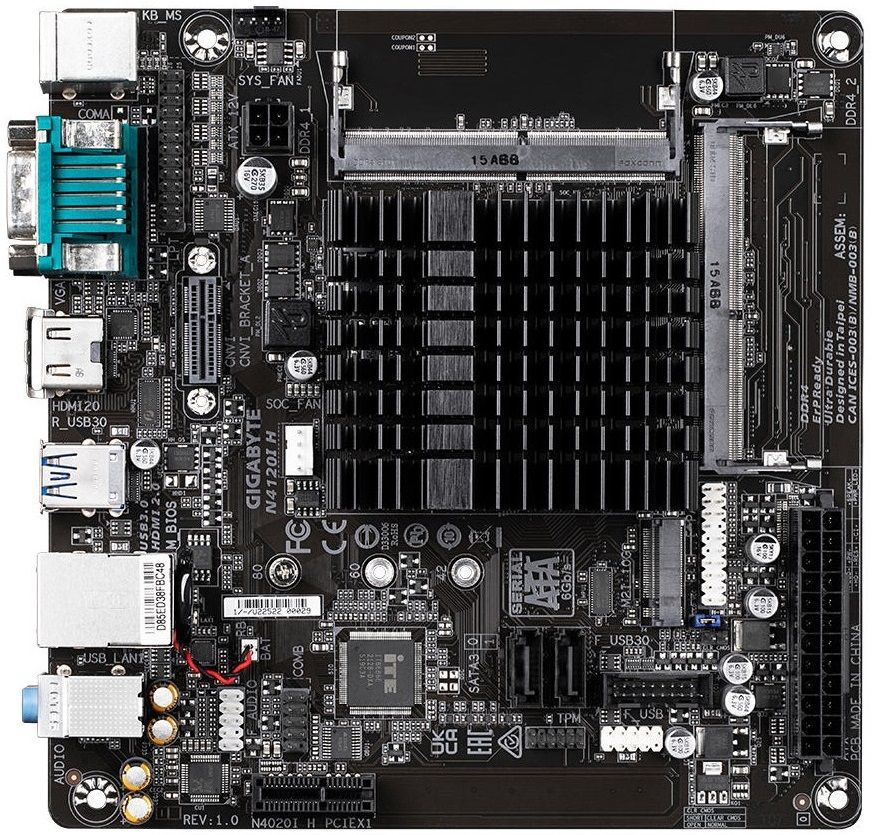 GIGABYTE N4120I H – компактна Mini-ITX материнська плата з вбудованим чотириядерним процесором Intel Celeron N4120 (до 2.6 ГГц). Підтримує до 16 ГБ DDR4 SODIMM, оснащена роз’ємами M.2 для SSD і Wi-Fi, SATA, HDMI, D-Sub, USB 3.2 Gen 1, COM-портом та Gigabit LAN.