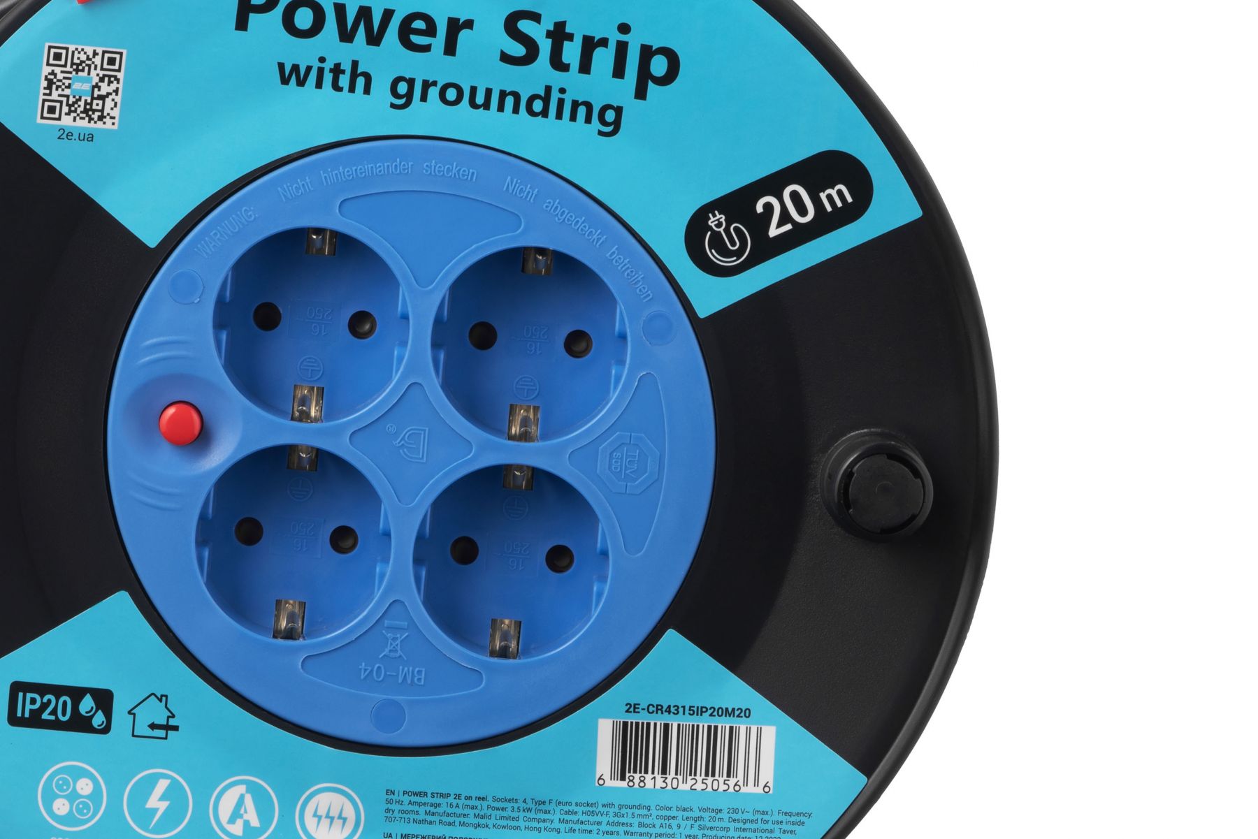 Мережевий подовжувач 2E 4XSchuko на котушці, ІР20, 3G*1.5мм, 20м, чорний