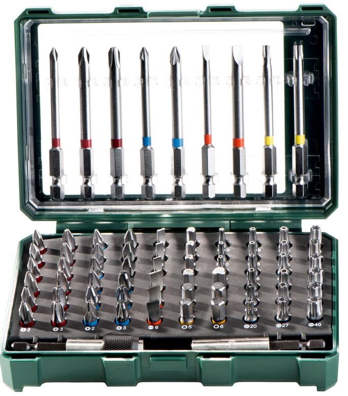 Інструментальні насадки з хромованадієвої сталi (якість S2). Насадки з умовною забарвленням: для швидкого і простого пошуку необхiдної інструментальної насадки. Магнітний тримач насадок для швидкої заміни - магнітний тримач для інструментальних насадок. Високоякісний, міцний футляр спеціального дизайну Metabo, висувне кріплення з отвором євростандарту.