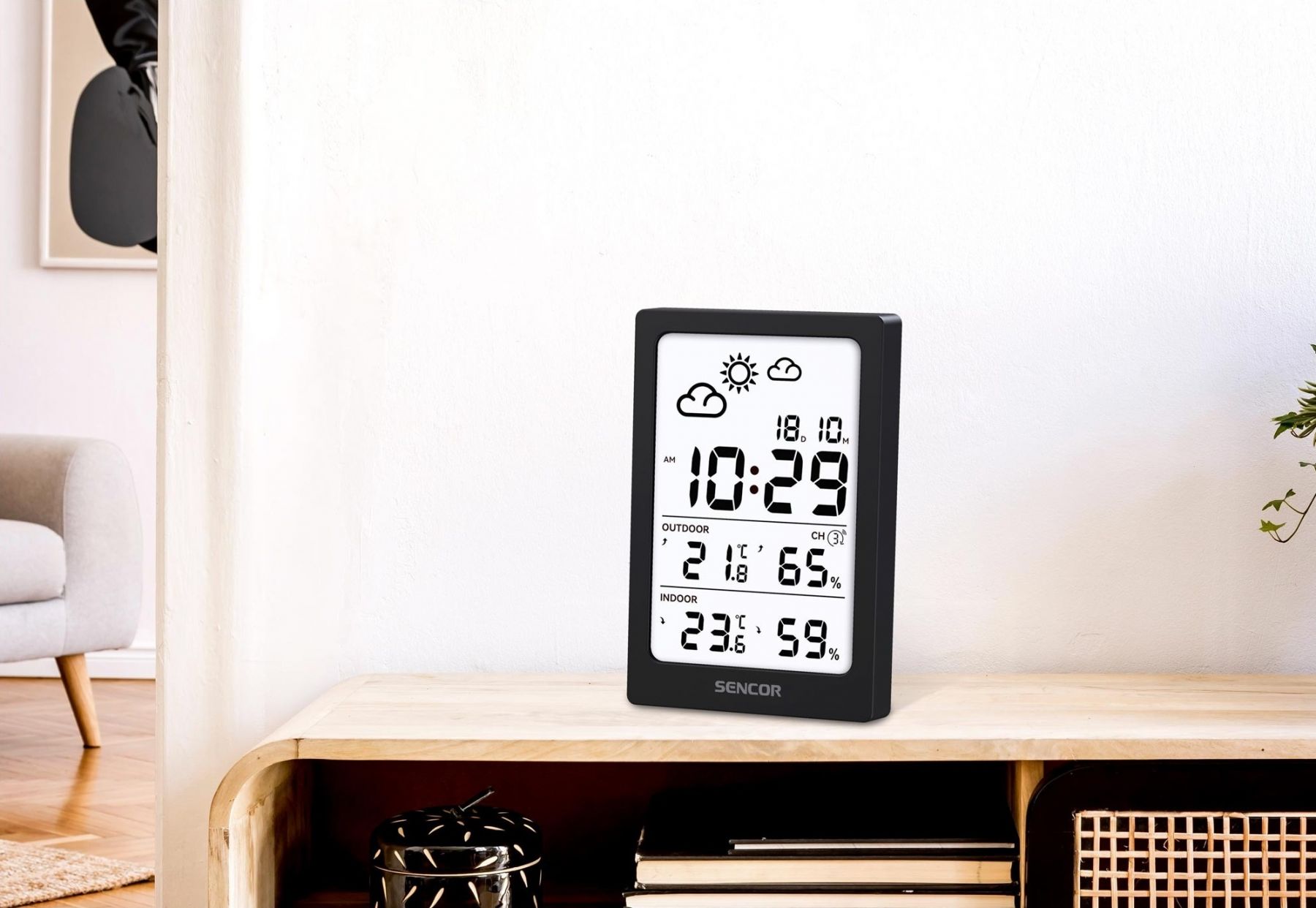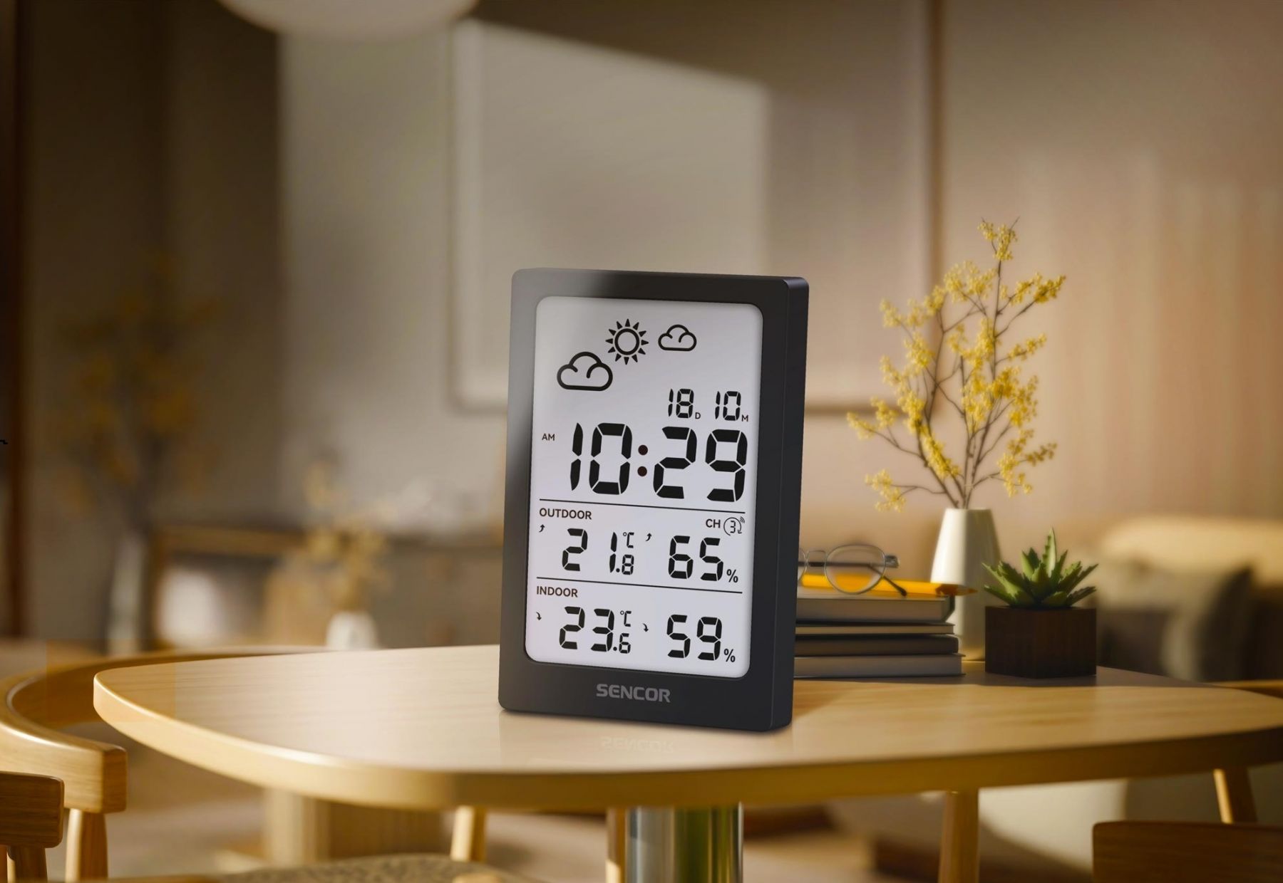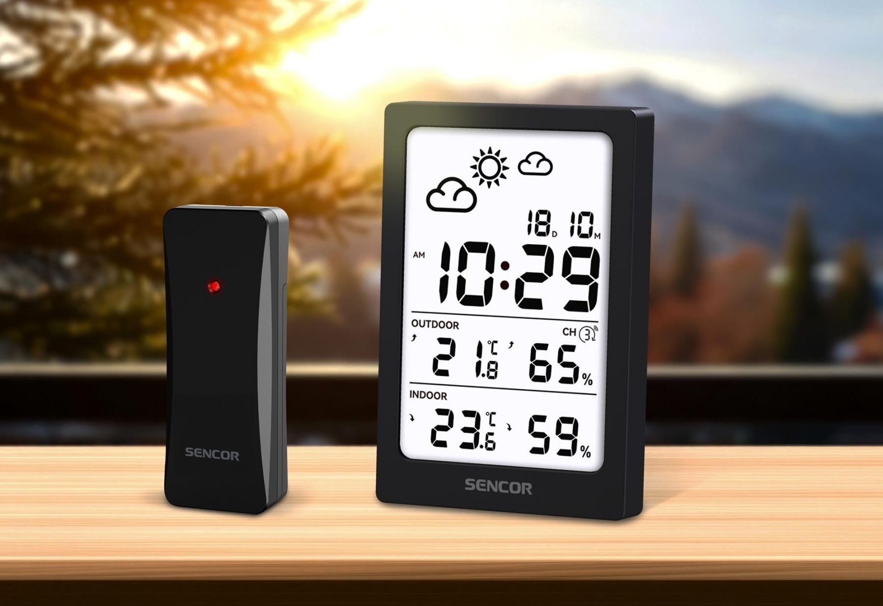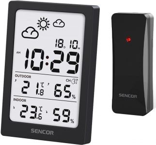 Метеостанція Sencor SWS2300B з бездротовим датчиком вимірює температуру та вологість у приміщенні й на вулиці, зберігає максимальні та мінімальні значення за 24 години та прогнозує погоду за допомогою графічних значків. Має годинник, подвійний будильник і попередження про заморозки. Сумісна з трьома зовнішніми датчиками.
