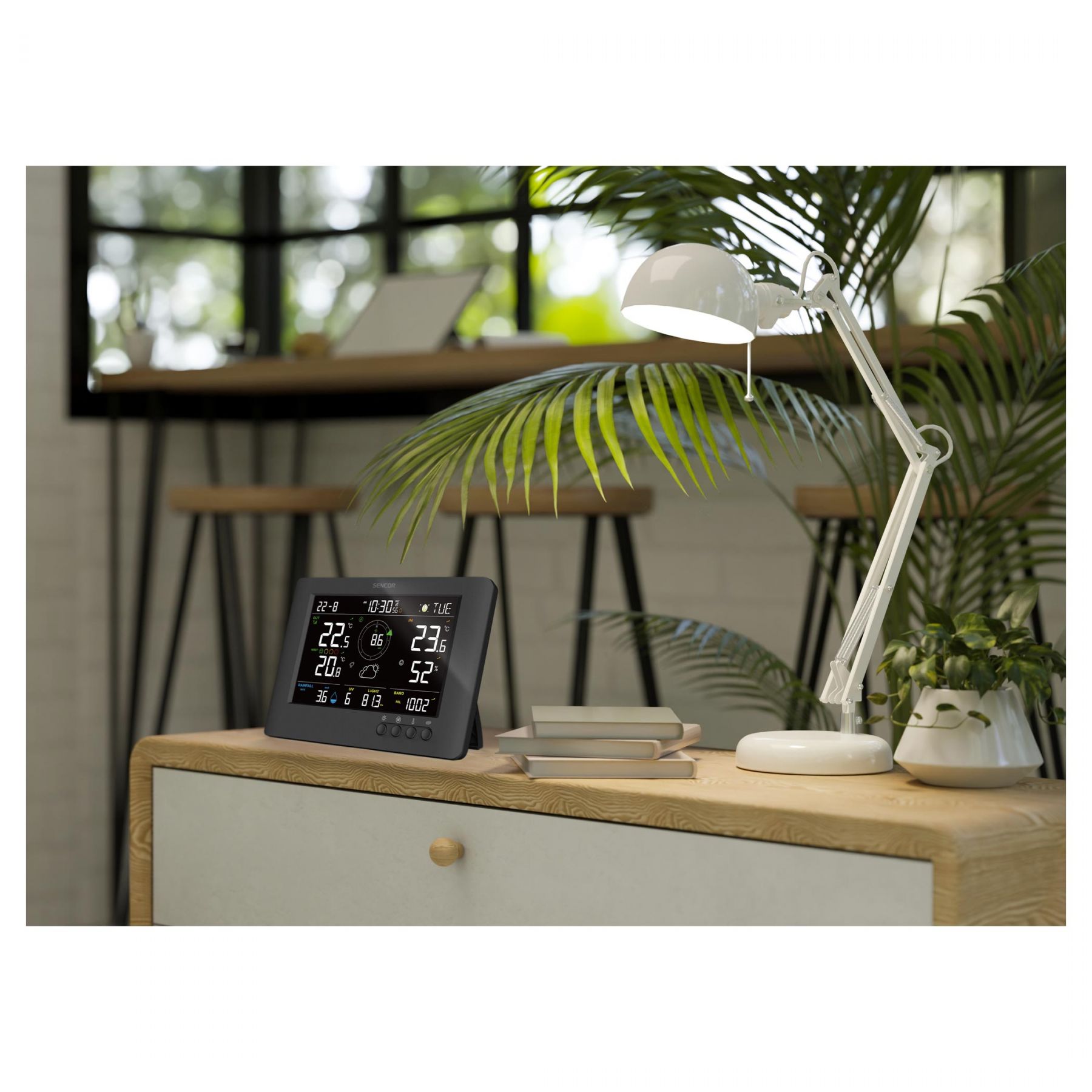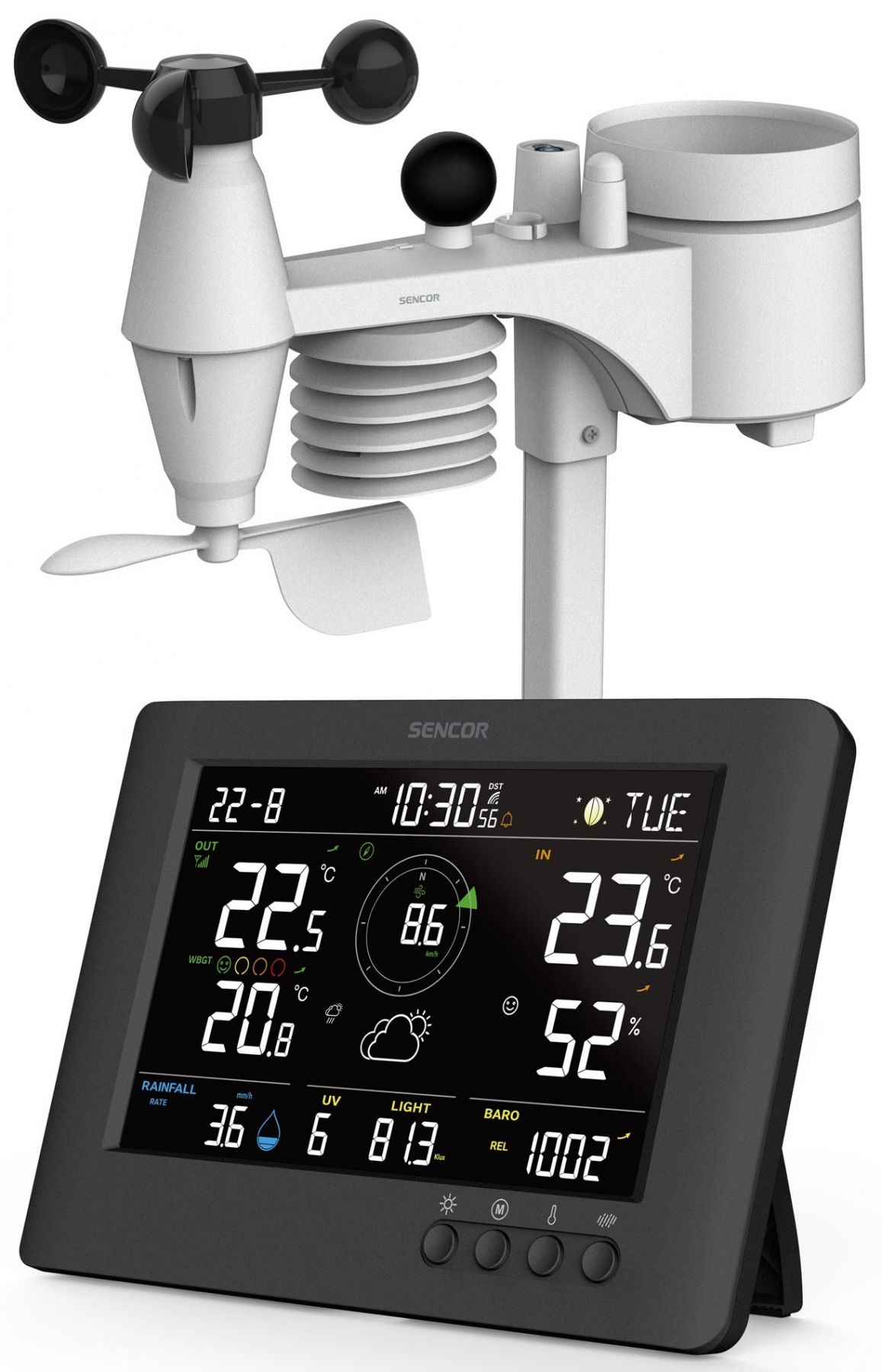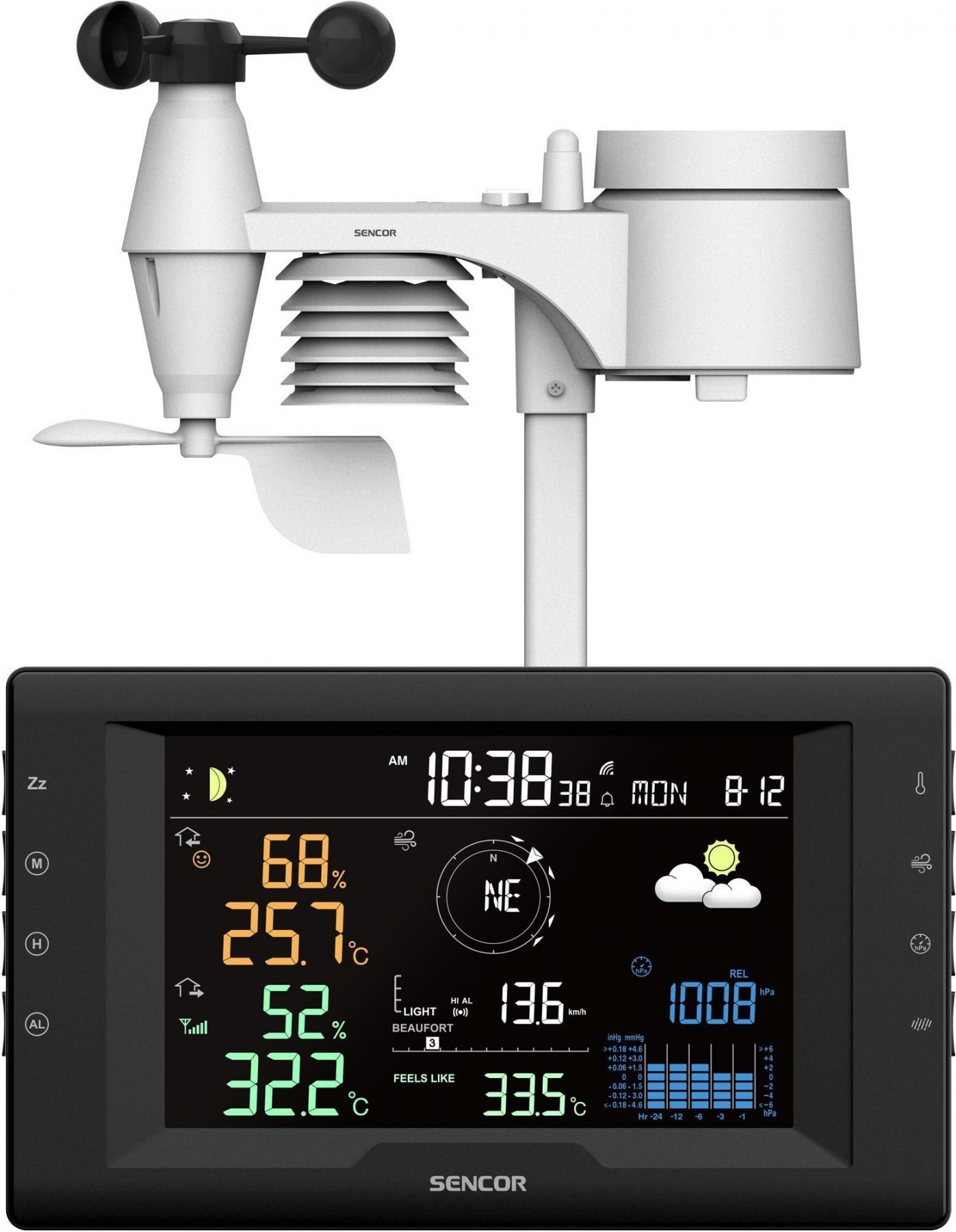 Функції:годинник, будильник, температура зовнішня, температура внутрішня, вологість внутрішня, вологість зовнішня, прогноз погоди, календар, дата, гигрометр, шкала Бофорта, відображення часу, температура та вологість у приміщенні, зовнішня температура та вологість, вимірювання інтенсивності світла, напрямок і швидкість вітру, опади, вимірювання інтенсивності опадів, УФ-індекс (0–16) з індикатором рівня УФ-випромінювання, рівень Бофорту та рівень швидкості вітру, реальний час і переважний напрямок вітру, налаштування сповіщення (для погодних умов: висока швидкість вітру, велика кількість опадів тощо), вимірювання швидкості вітру, попередження про ожеледь, індекс WBGT (температура вологого термометра), показники абсолютного та відносного тиску, індекс спеки, відчутна температура, охолодження вітром, точка роси, налаштування сповіщення про високий/низький рівень для температури та вологості в приміщенні/на вулиці, погодинний запис за останні 24 години