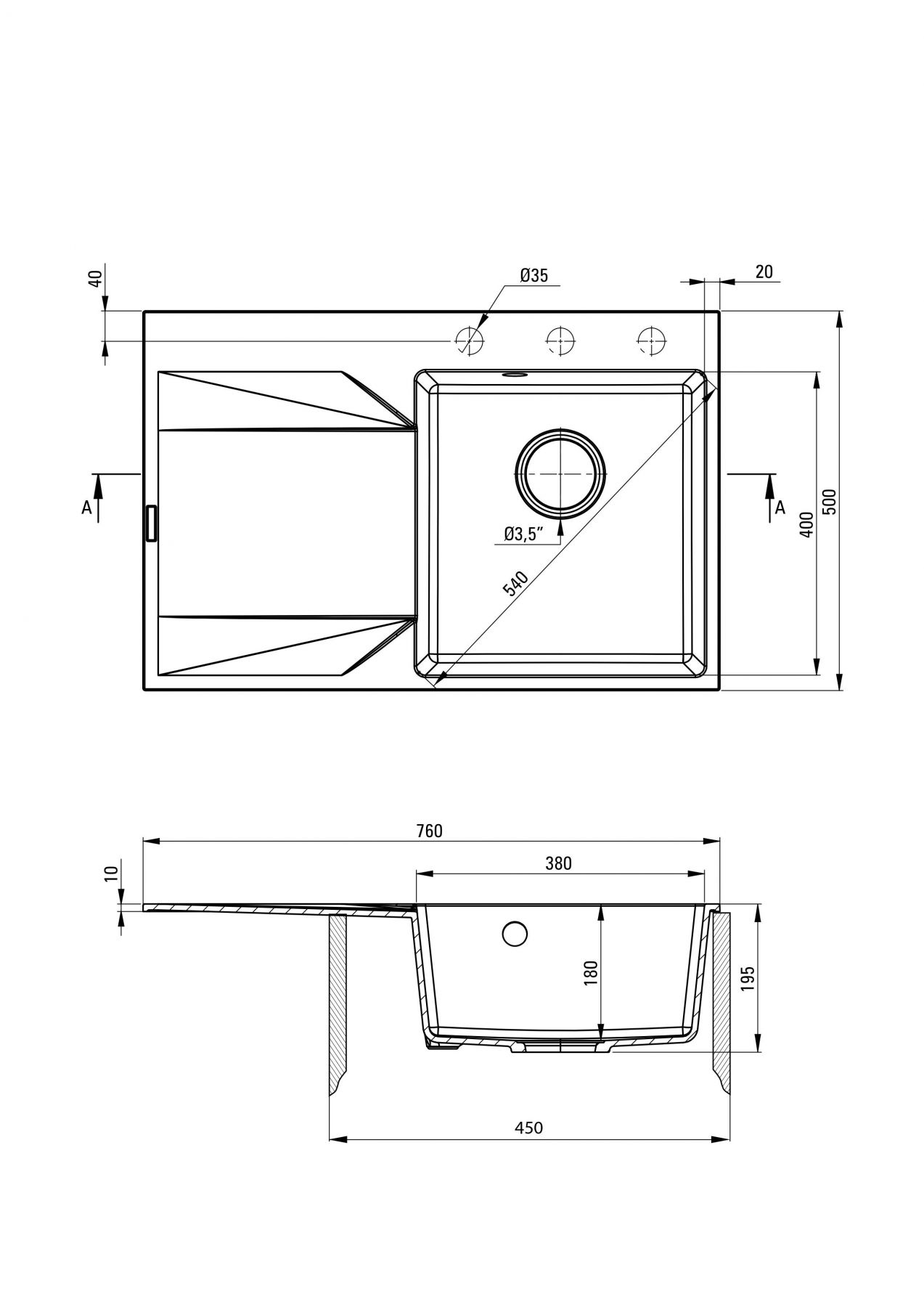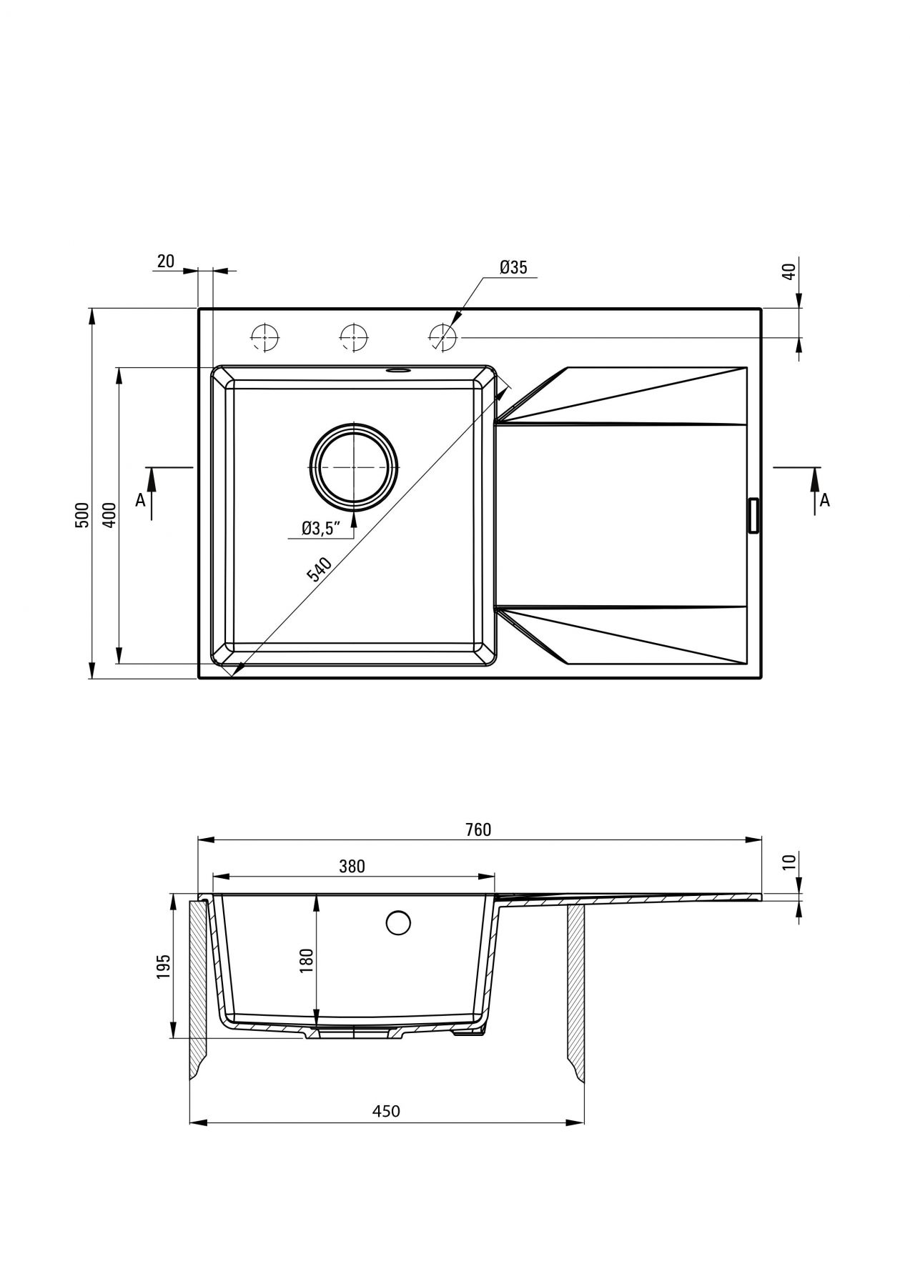 Мийка кухонна Deante Evora, граніт, прямокутна, з крилом, 760х500х195мм, чаша - 1, врізна, графіт