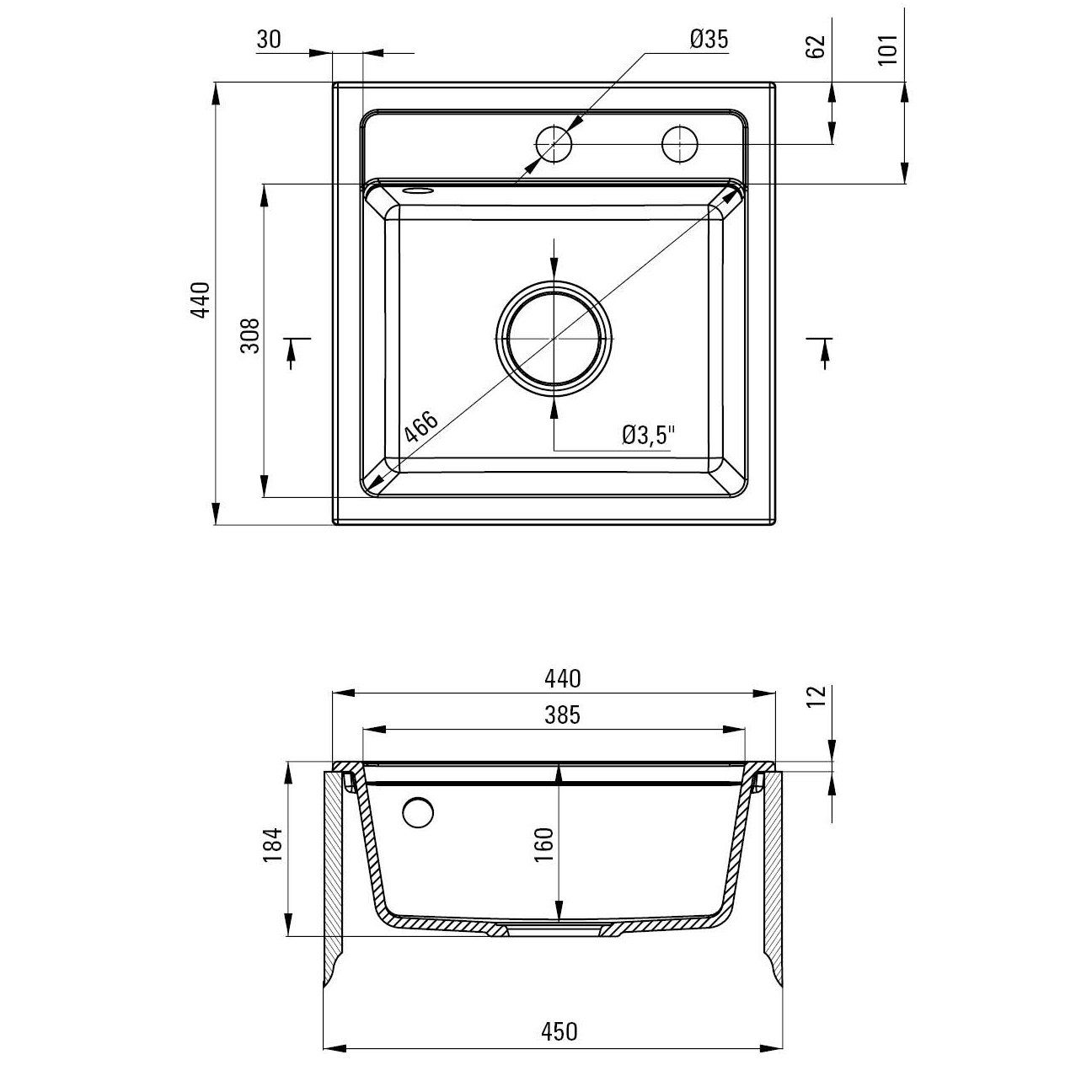 Мийка кухонна Deante Zorba, граніт, квадрат, без крила, 440х440х184мм, чаша - 1, накладна, металічний сірий