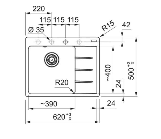 Мийка кухонна Franke Centro, фраграніт, прямокутник, з крилом, 620х500х200мм, чаша - 1, врізна, CNG 611-62 TL, чорний матовий