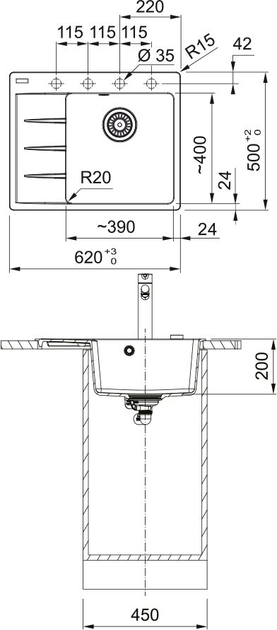 Мийка кухонна Franke Centro, фраграніт, прямокутник, з крилом, 620х500х200мм, чаша - 1, врізна, CNG 611-62 TL, сірий камінь