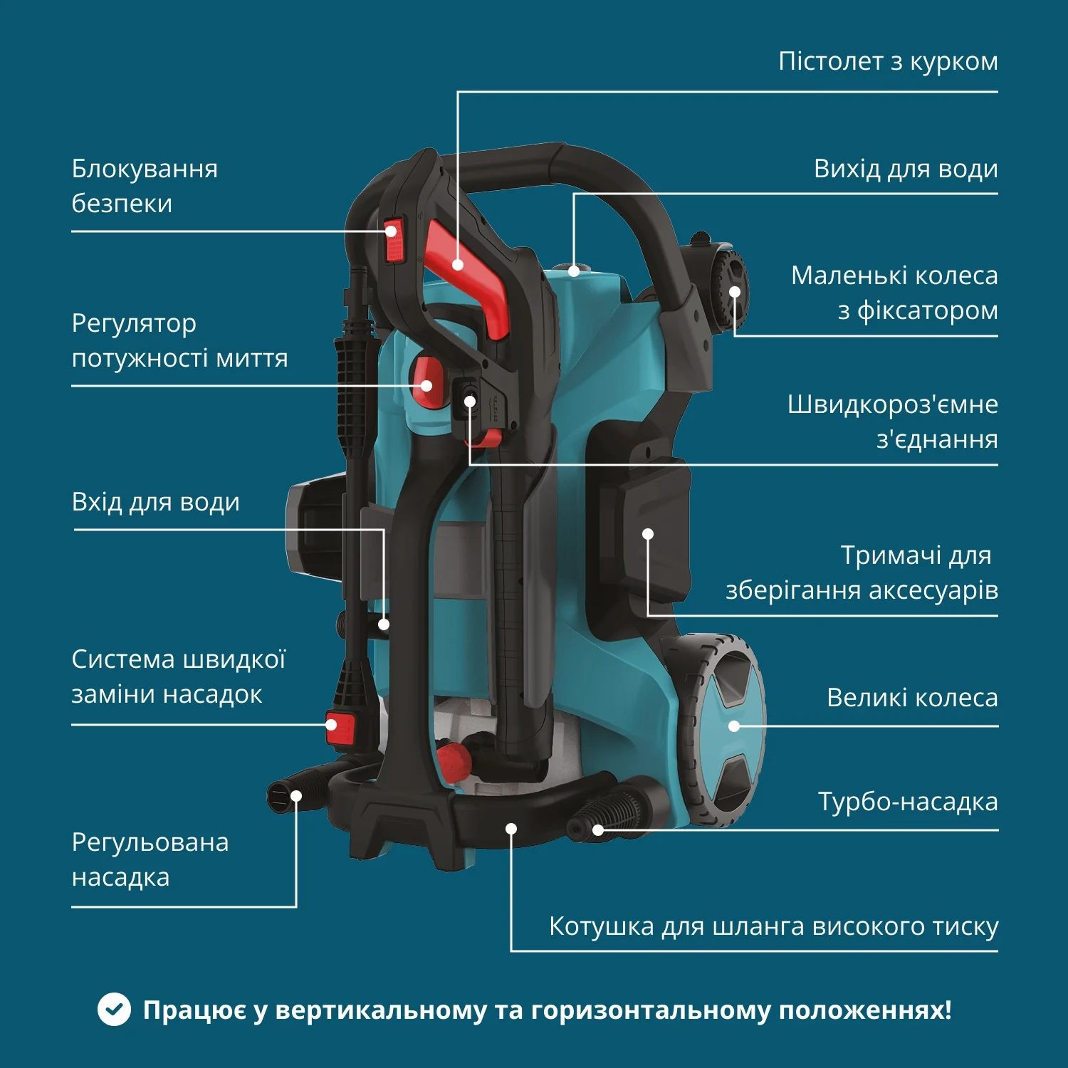 Комплектація:кабель, шланг високого тиску, водяний фільтр, турбо-насадка, роторна насадка, Піноутворювач, шпилька для очищення насадки, швидкороз'ємний розпилювальний пістолет, швидкорегульована насадка