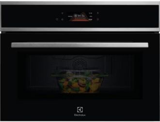 Electrolux EVM8E09X — вбудована багатофункціональна духова шафа з функцією мікрохвильової печі, об’ємом 44 л та потужністю 2100 Вт. Сенсорне керування, гриль, конвекція, автоматичні програми (попкорн, розморожування, підігрів, плавлення), швидкий нагрів, пам’ять налаштувань та захист від дітей. Покриття з нержавіючої сталі з Antifingerprint, галогенове освітлення, легке очищення. Ідеальне рішення для сучасної кухні з обмеженим простором, що поєднує духовку та мікрохвильовку в одному приладі.