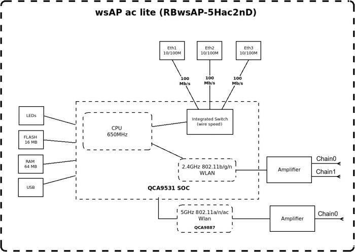 WsAP ac lite - настінна дводіапазонна точка доступу від компанії MikroTik для готелів, аеропортів, вокзалів, торговельних центрів, лікарень, має ненав'язливий корпус, який підходить до стандартних розеток на стіні. Пристрій не привертає особливої уваги та органічно впишеться в будь-який інтер'єр. WsAP оснащена процесором QCA9531 з тактовою частотою 650 MHz, 64 МВ оперативної пам'яті, трьома Ethernet портами, один з яких (PoE in) підтримує стандарт 802.3af/at з напругою 18-57 V, а порт Ethernet 3 - живлення за технологією Passive PoE для подачі живлення на сумісні пристрої, USB 2.0 портом для підключення та заряджання мобільних пристроїв або зберігання даних, а також RJ11 роз'ємом для підключення IP-телефонів. Також точка доступу обладнана інтегрованою антеною з коефіцієнтом підсилення 1.5 dBi на частоті 2.4 GHz та 3 dBi на частоті 5 GHz. Максимальна потужність радіомодуля на частоті 2.4 GHz досягає 22 dBm, а на частоті 5 GHz - 23 dBm. Пристрій забезпечує одночасне покриття частотних діапазонів 2.4 GHz з підтримкою бездротових стандартів 802.11 b/g/n та 5 GHz з підтримкою бездротових стандартів 802.11a/n/ac. Максимальна швидкість Wi-Fi в діапазоні 2.4 GHz досягає 300 Mbps та 433 Mbps на частоті 5 GHz.