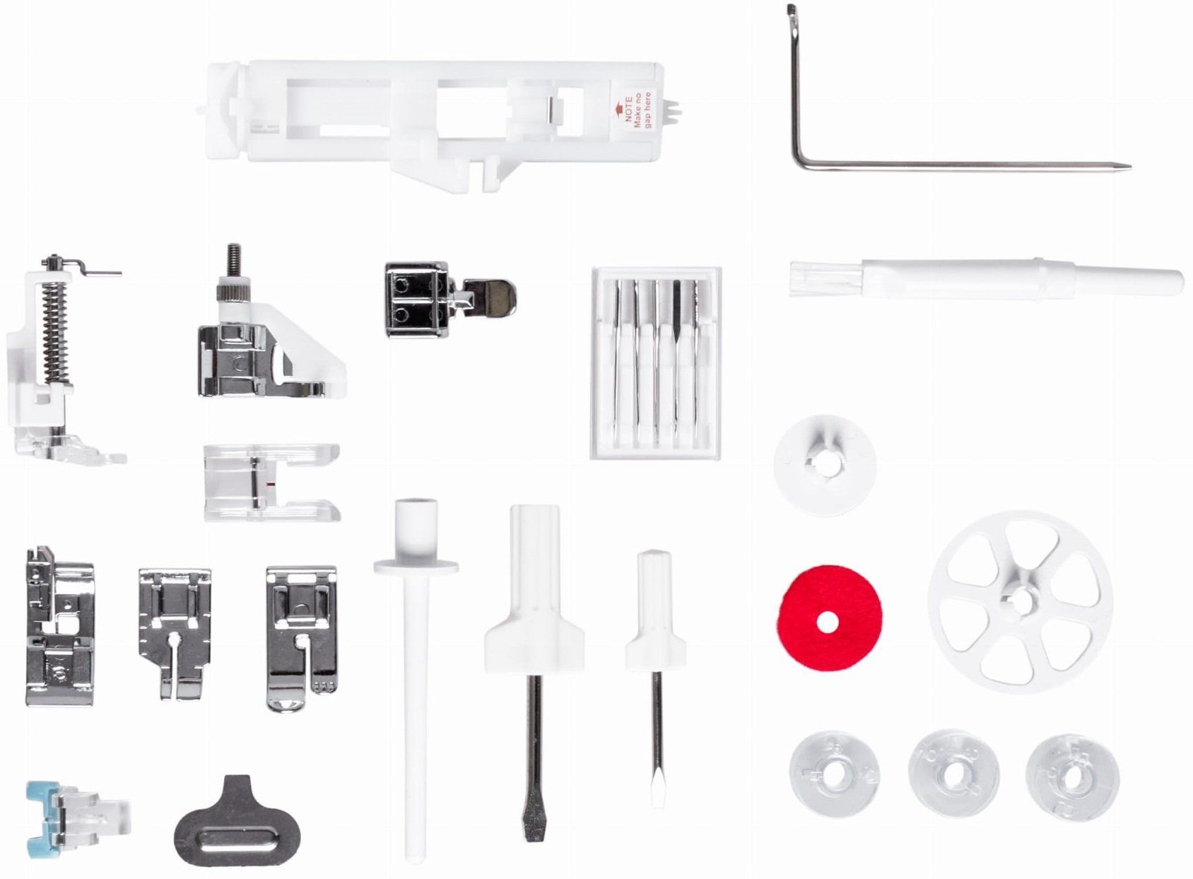 Комплектація:інструкція, Набір голок, Большой и маленький держатели для катушек, Чохол, Шпульки, Педаль, Універсальна лапка, Лапка для пришивання ґудзиків, Фетрова прокладка, Лапка для квілтінга, Лапка для блискавок, Лапка для вишивання, Лапка для потайного шву, Направляющая для выстегивания, Вспорювач-щіточка, Мала викрутка, Викрутка для голкової пластини, Лапка для петель, Лапка для гладильных стежков, Лапка для подшивки, 1/4 стегальная лапка, Дополнительный штифт для катушки, коленоподъемник