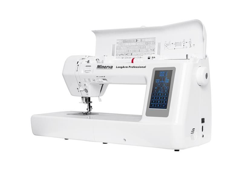 Minerva LongArm Professional – це унікальна комп'ютерна машина, її величезний робочий простір (30,5 см від корпусу до голки та 46 см по всій довжині) дозволяє працювати з великими та складними проектами. Вистібування вручну на ній можливе і комфортно завдяки тому, що вона має знімний транспортер, відмінне світлодіодне освітлення та спеціальну лапку для квілтингу. Варто відзначити, що у своєму ціновому діапазоні це єдина машина з такою величезною відстанню між голкою та важелем (стандарт – близько 20 см), потужністю двигуна – 90 Вт та швидкістю роботи –1000 проколів за хвилину. У машину вбудовано до 500 стібків: робочі, оверлочні, декоративні, для квілтингу, трикотажні, 3 види алфавіту, цифри, 11 видів петель, що полегшує виконання навіть найскладніших задач.