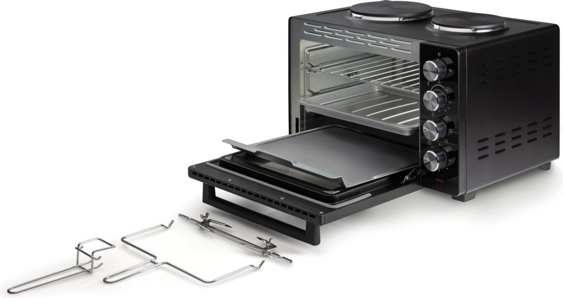 Міні піч Gorenje OM30GBX з об’ємом 30 л оснащена двома електричними конфорками потужністю 1000 Вт та 600 Вт. Має внутрішню потужність 1600 Вт, червоний індикатор роботи, тримач для дека. Загальна приєднувальна потужність – 3200 Вт.