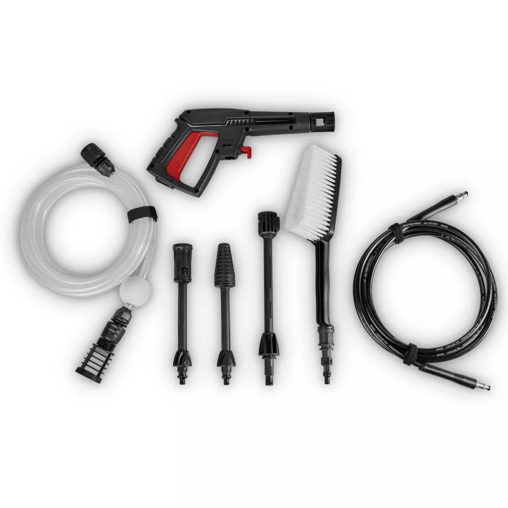 Комплектація:документація, без зарядного пристрою, без акумулятора, мінімийка високого тиску, мішок для аксесуарів, пінна насадка, багатофункціональна насадка 4-в-1 (точковий струмінь, віяловий розпил, брудова фреза, розпилення), всмоктувальний шланг 5 м із фільтром