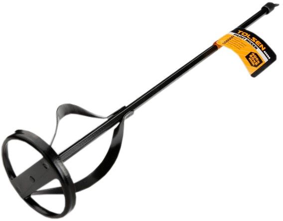 Мішалка Tolsen із хвостовиком шестигранної форми, виготовлена з вуглецевої сталі з порошковим покриттям, призначена для ефективного перемішування фарб та інших рідких будівельних сумішей.