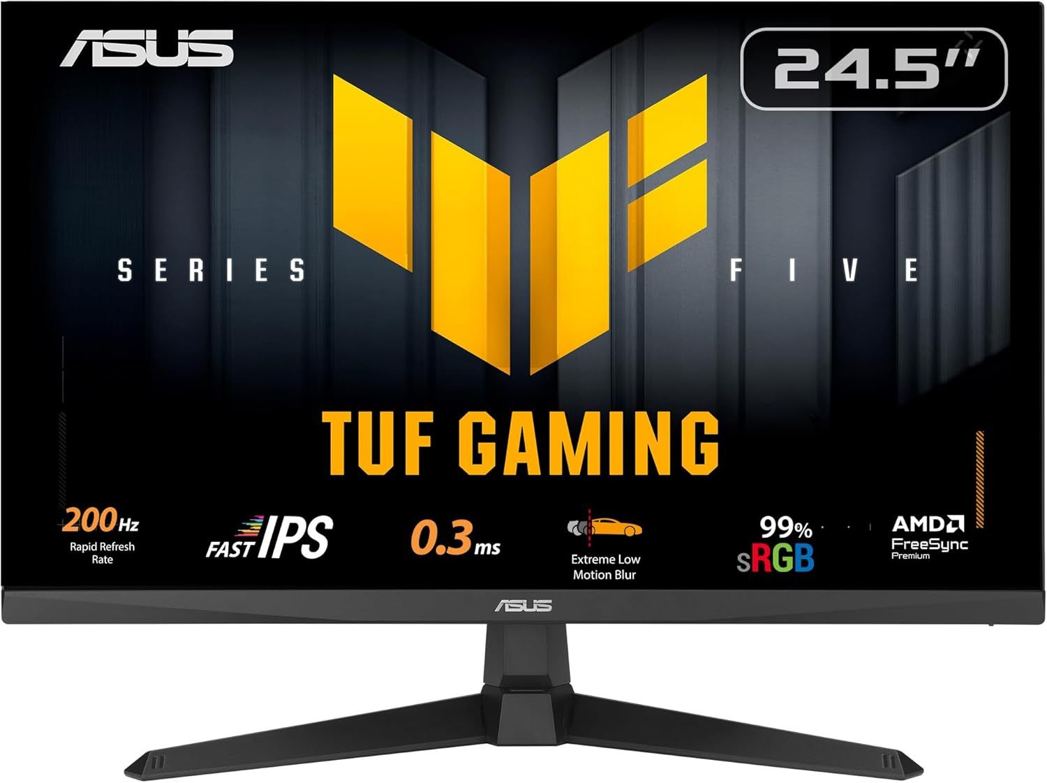 Монітор Asus TUF Gaming VG259Q5A — 24.5″ Full HD з надшвидким оновленням 200 Hz, часом відгуку 0.3 мс (GTG) і підтримкою AdaptiveSync (FreeSync Premium, G‑Sync Compatible). IPS‑матриця з широкими кутами огляду та 99 % sRGB забезпечує яскраві, насичені кольори, а ELMB Sync дозволяє уникнути розмиття в динамічних сценах.