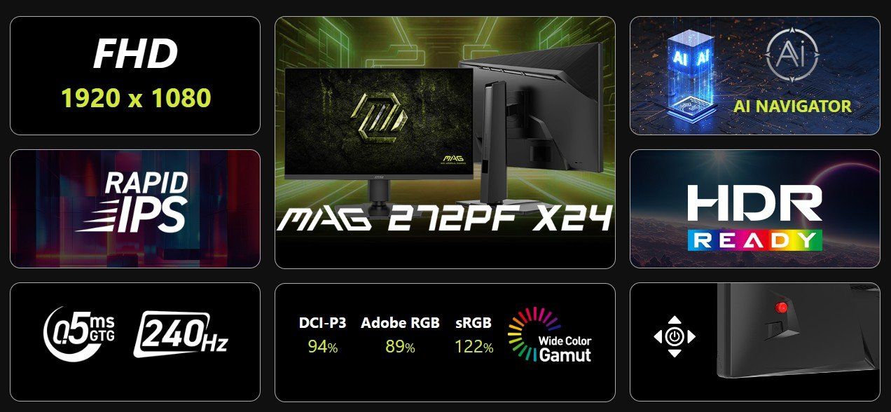 MSI MAG 272PF X24 — 27-дюймовий ігровий монітор з роздільною здатністю 1920×1080 та Rapid IPS-матрицею. Частота оновлення 240 Гц разом із часом реакції 0,5 мс GtG формує чітке відтворення швидких сцен. Антиблікове покриття зберігає комфорт під час інтенсивних ігрових сесій. Розширене колірне охоплення sRGB 122% підсилює насиченість зображення. Ергономічна конструкція з Pivot і регулюванням висоти спрощує організацію робочого простору.