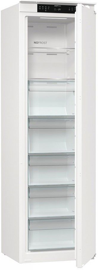 Вбудована морозильна камера Gorenje FNCI517E41WF поєднує місткість 235 літрів із системою NoFrost для стабільного зберігання продуктів без утворення льоду. Інверторний компресор забезпечує рівномірну роботу та контроль температури. Технологія AdaptTech адаптує режим охолодження до циклів відкривання дверцят. Конструкція зі слайдерним кріпленням інтегрується у кухонні меблі. Рівень шуму 35 дБ відповідає умовам житлового простору.