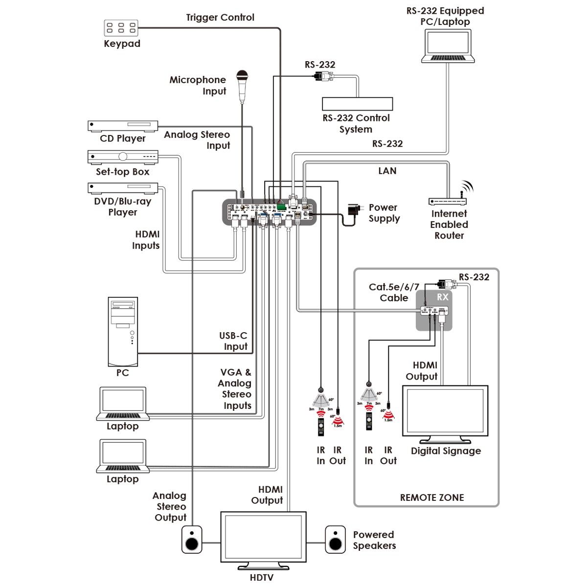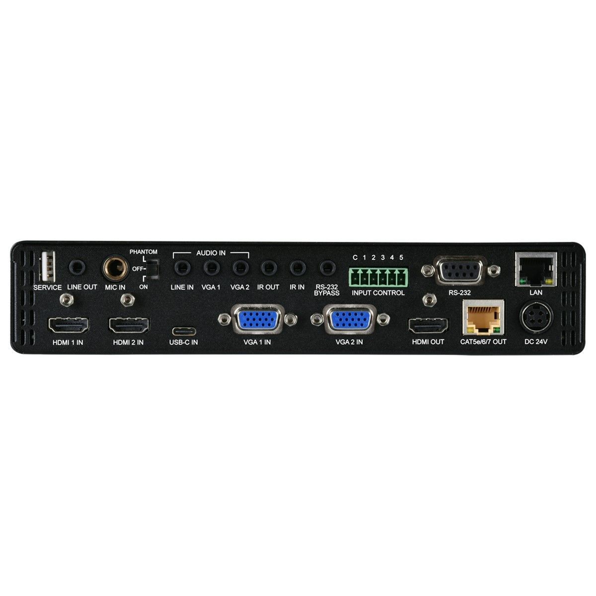 Входи:VGA, HDMI, 1×RS-232, HDBaseT(RJ-45), 1xIR IN (3.5mm), 1 x LAN, 2xHDMI, 1xUSB2.0 (Type-A), 1хUSB-C, 3 х аналоговий стерео (3,5 мм), 1 х вхід мікрофона (6,5 мм), 5 входів керування (6-контактний клемний блок)