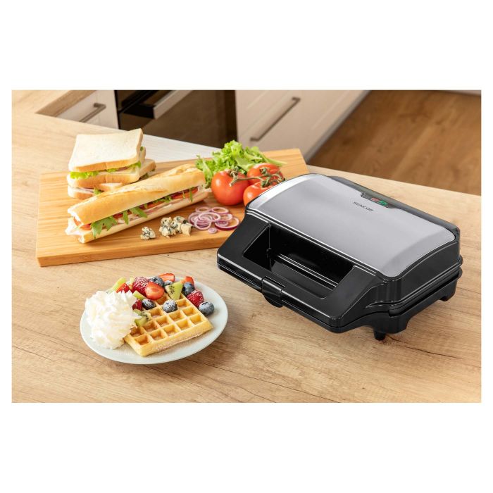 Ви любите балувати себе тостами, паніні, багетами та вафлями, не виходячи з дому? Тоді зробіть ставку на мультимейкер Sencor зі змінними пластинами SSM9940SS. Для кожного виду тіста є чотири змінні поверхні для випічки, навіть типового американського сендвіча більшого розміру. Перевага бутербродниці полягає в тому, що її пластини мають антипригарне покриття, завдяки чому їх дуже легко чистити. Чорно-сріблястий колір мультимейкера буде гарно поєднуватись з будь-яким дизайном кухни.