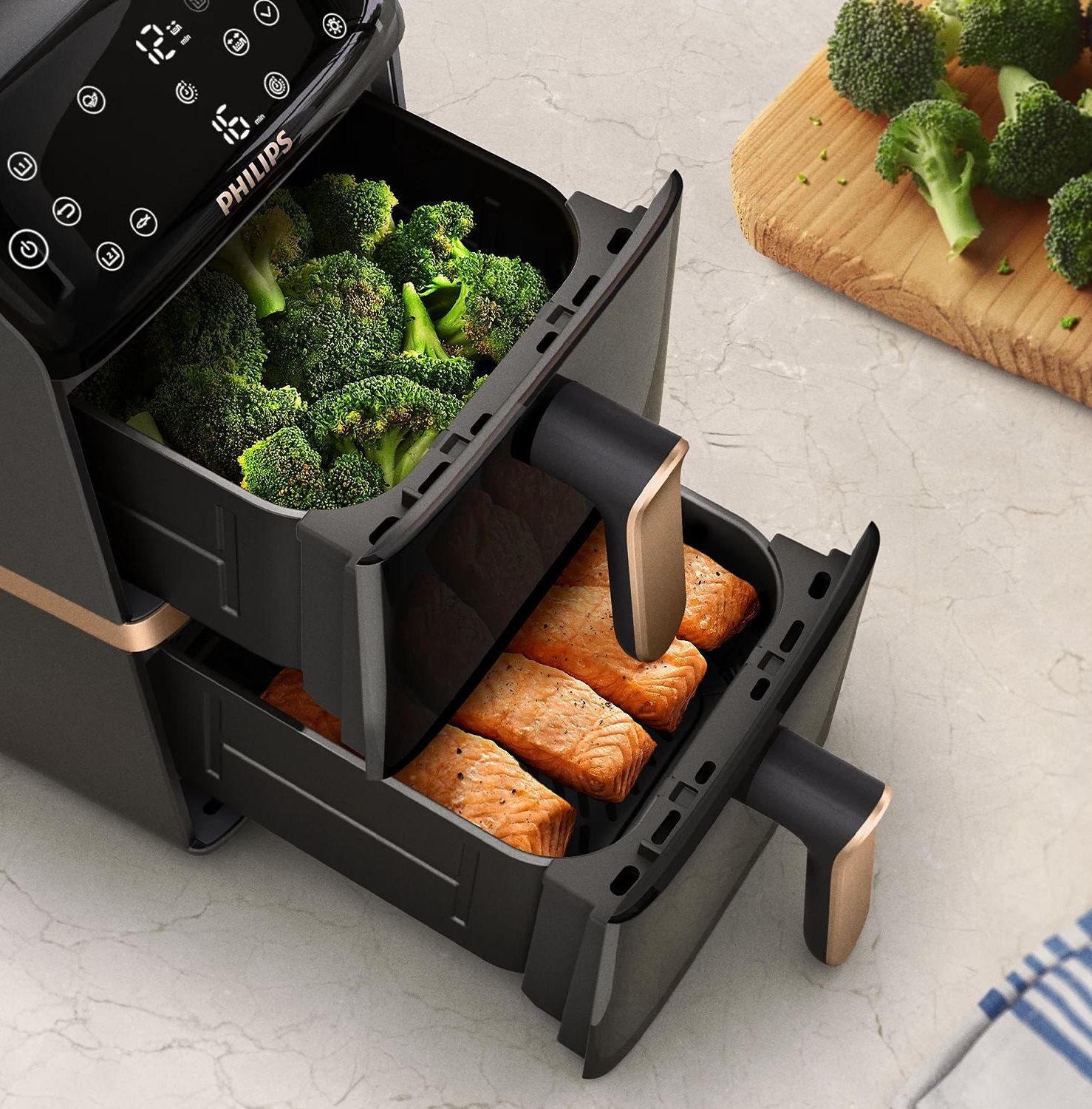 Мультипіч Philips Stacked Dual NA462/70 — це компактна двоярусна аерофритюрниця з подвійним кошиком по 5 л кожен, яка дозволяє готувати дві страви одночасно. Потужність 2300 Вт і технологія RapidAir забезпечують рівномірне приготування з хрусткою скоринкою та мінімальною кількістю олії. Пристрій оснащено сенсорним управлінням, 6 автоматичними програмами та інтелектуальною синхронізацією часу. Завдяки ергономічній конструкції займає на 45% менше місця на кухні.