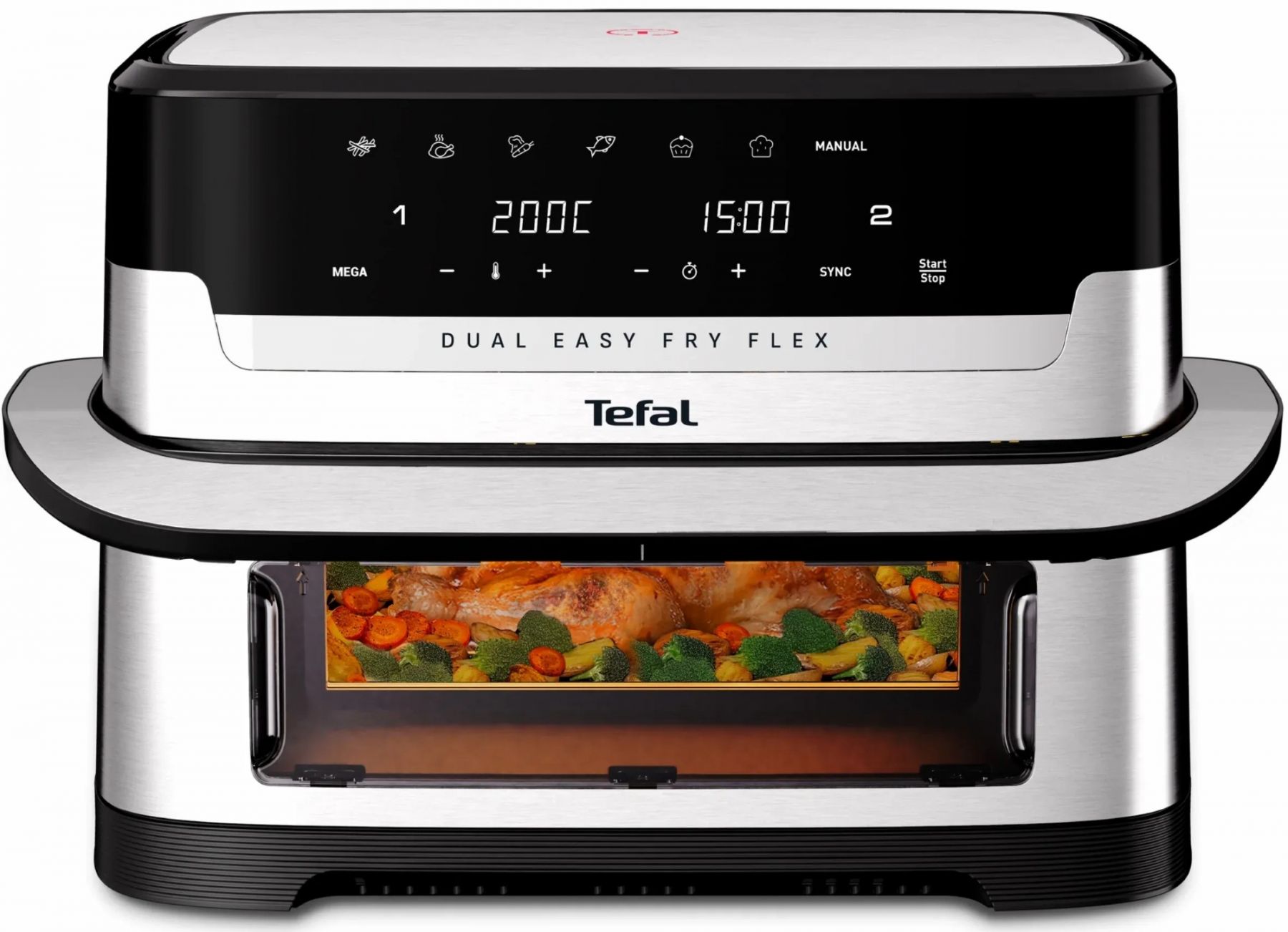 Мультипіч Tefal Dual Easy Fry Flex поєднує універсальність двох незалежних зон та місткість однієї великої чаші GiantZone об’ємом 9 л. Завдяки знімному роздільнику FlexCook можна готувати дві різні страви з окремими налаштуваннями або об’єднати простір для великої порції на всю родину. Технологія Extra Crisp забезпечує циркуляцію гарячого повітря для хрусткого результату з мінімальною кількістю олії, а функція SYNC допомагає синхронізувати завершення приготування двох програм.