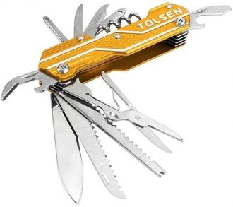 Мультитул Tolsen, 15 елементів, інструмент для витягування гачків, інструмент для чищення риби, иінструмент для догляду за нігтями, викрутка хрестова мала, пилочка для нігтів, штопор, пила, відкривачка для консервів, ніж, викрутка шліцева, голка, пробивач для шкіри. Компактний та зручний у використанні, він ідеально підходить для активного відпочинку, риболовлі, туризму або щоденних завдань.