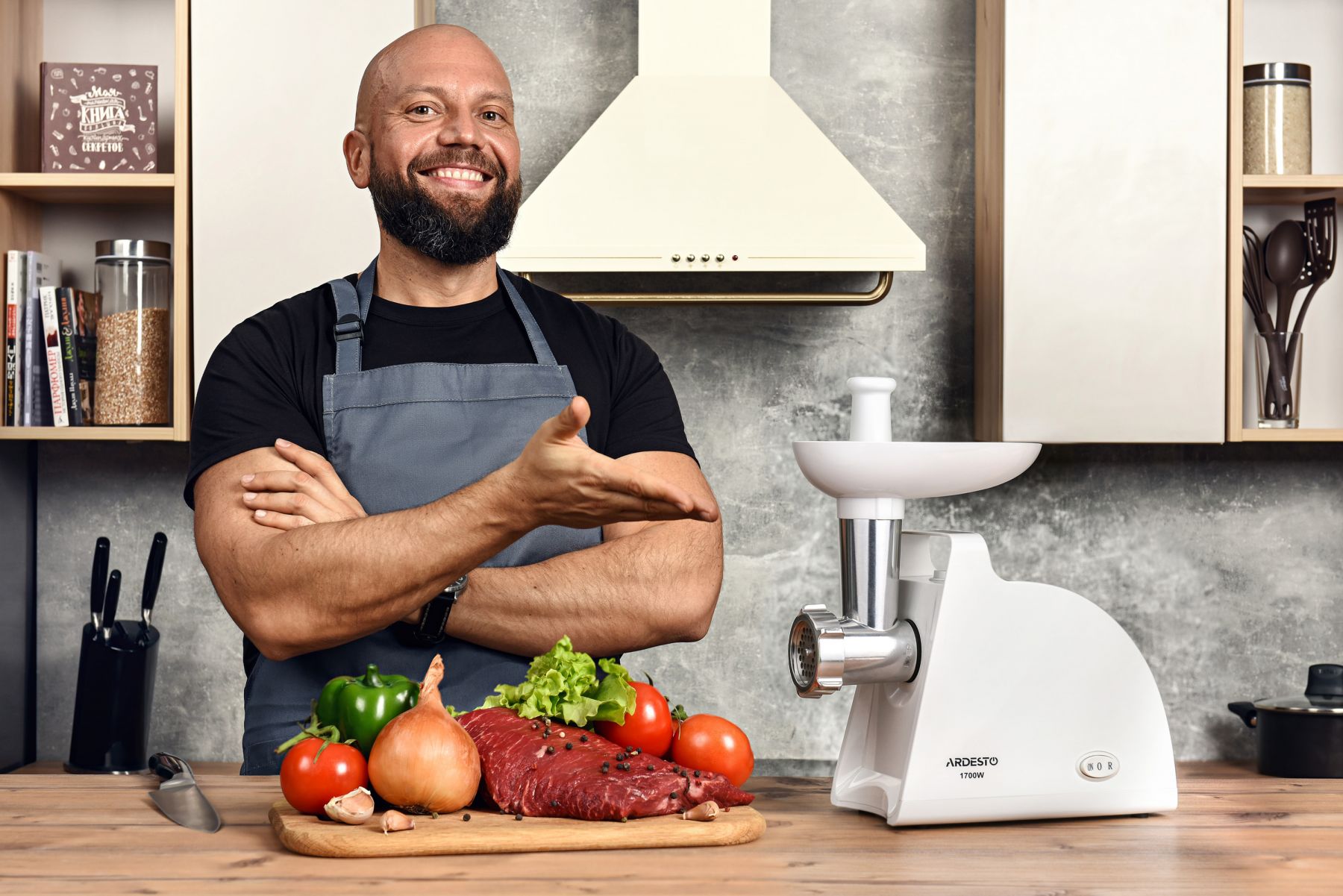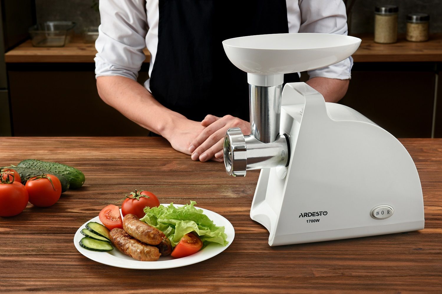 Компактна м’ясорубка з потужністю 1700 Вт та змінними насадками для приготування фаршу, домашніх ковбасок та кеббе.