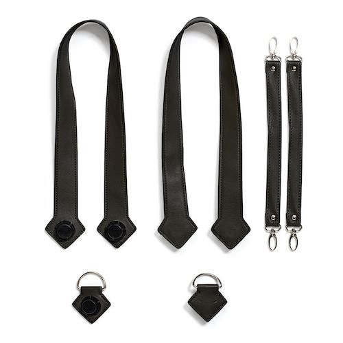 До набору із штучної шкіри входять: ручки, фіксатори, ремені на коляску. Виготовлені із поліуретану з гумовими та деталями із цинкового сплаву.