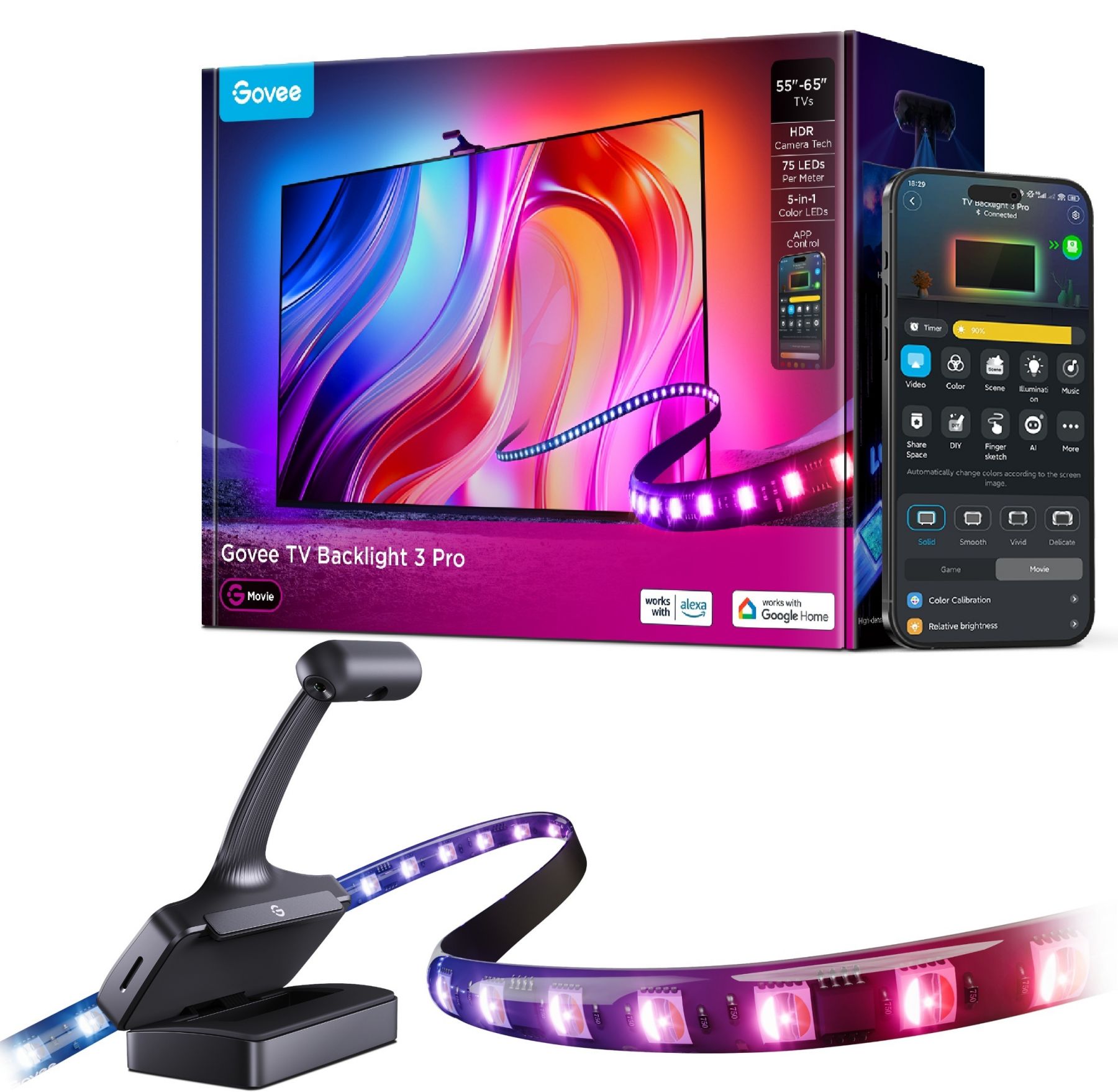 Набір адаптивного підсвічування Govee R2A80 Three-camera TV Backlight 55-65" синхронізує освітлення зі вмістом на екрані за допомогою потрійної HDR-камери. Система точно відтворює кольори фільмів, серіалів і ігор завдяки багатозонному калібруванню та алгоритмам подвійної експозиції. Підсвічування працює з додатком Govee Home, голосовими помічниками та підтримує синхронізацію з іншими пристроями Govee через DreamView.
